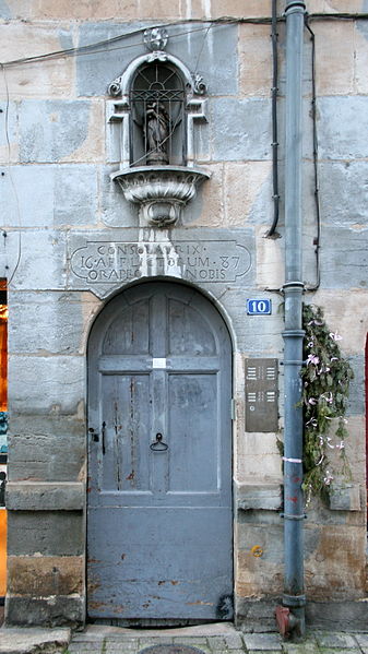 La porte d'entrée avec son inscription de 1687 et la niche placée au-dessus : inscription par arrêté du 8 juillet 1942