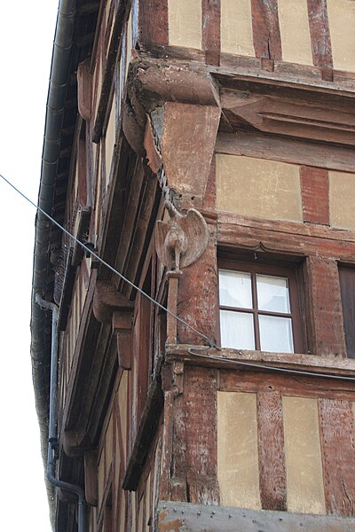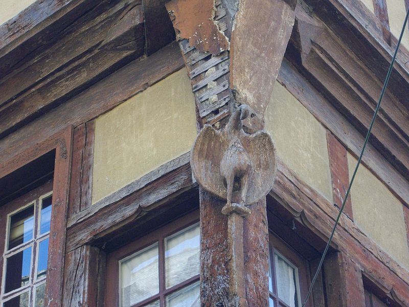 Édification de la maison en pans de bois avec encorbellements.