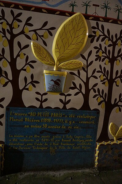 La maison du «Petit-Paris», ou maison de Marcel Dhièvre, est une demeure décorée dans un style art naïf située à Saint-Dizier (Haute-Marne, Grand Est) et inscrite au titre des Monuments historiques depuis 1984. Marcel Dhièvre a orné sa maison à un étage, nommée Au Petit-Paris, d'une décoration naïve et décorative où les éléments se répondent pour former un récit. La décoration ne se limite pas au dessin : elle joue aussi sur le relief, comme l'arbre et le corbeau qui ressortent de la façade, accompagnés d'un renard en ronde-bosse. Une flore exubérante encadre portes et fenêtres tout en assurant la cohérence du récit. La miniaturisation permet d'inclure de nombreuses scènes narratives et d'évoquer ainsi une multitude de tableaux sur une maison de proportions modestes. L'artiste recourt fréquemment à une symétrie axiale pour structurer chaque thème. Il intègre dans ses réalisations des matériaux variés — faïence, verre et divers fragments — pour jouer sur la texture et la couleur. Son inspiration puise dans le quotidien — chats, pigeons, déroulement des saisons — ainsi que dans les monuments qu'il a découverts à Paris en allant y chercher de la marchandise. Outre la décoration extérieure, Marcel Dhièvre a réalisé des tableaux sur panneau de bois et des sculptures visibles dans la maison. Né le 23 juillet 1898 à Laneuville-au-Pont de parents ouvriers agricoles, il travailla jeune comme journalier à la ferme Valois. Une paralysie partielle de la main droite le dispensant d'aller au front pendant la Première Guerre mondiale est mentionnée dans sa biographie. En 1920 il devint charpentier à la S.N.C.F. à Saint-Dizier et il acheta sa maison, au 478 avenue de la République, en 1922. Il quitta son emploi pour ouvrir avec son épouse Justine Croute un commerce de bonneterie au rez-de-chaussée et en ambulant ; divorcé en 1935, il se remaria en 1937 avec Constance Colasse, à qui il dédia son œuvre, et vécut avec elle à Eurville. À sa retraite en 1960 il se consacra de plus en plus à son art, restant très attaché à ses réalisations, en donnant peu et sans les vendre. Il est décédé à son domicile le 27 novembre 1977. La maison a été rénovée en 2012 après avoir d'abord été sauvée par l'artiste Katy Couprie puis rachetée par la mairie de Saint-Dizier. En 2018-2019 l'association Au Petit Paris et la municipalité ont décidé de réhabiliter le bâtiment pour en faire un bar associatif ; la rénovation, dirigée par l'architecte et urbaniste Charlotte Lurat, a porté sur l'intégralité de la structure et a inclus la construction d'une extension, ainsi que des interventions sur la façade et la ruelle, mettant en valeur les détails de la façade du Petit-Paris.
