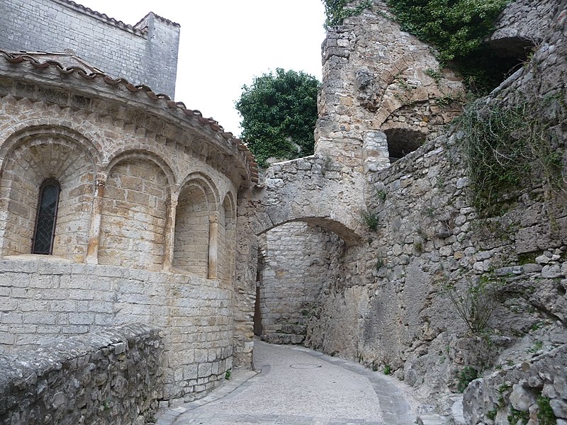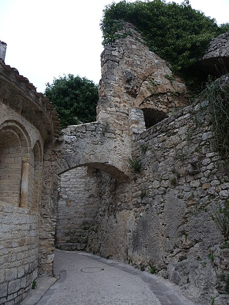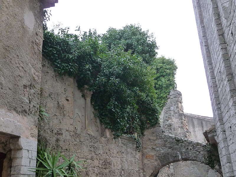 Le rez-de-chaussée présente trois grandes portes en plein cintre surmontées d'une corniche horizontale, portée par une rangée de pierres plates disposées en dents de scie. Les fenêtres géminées sont séparées par une ou deux colonnettes. Cette maison du XIIIe siècle comprend une chapelle, datée de 1682, élevée par la confrérie des pénitents de Saint Guilhem le désert.