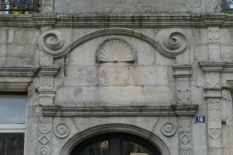 Façade en pierre de taille comprenant un rez-de-chaussée, deux étages et un comble. La porte d'entrée, placée dans l'axe, est encadrée de part et d'autre par des travées de fenêtres soulignées de pilastres superposés et surmontées d'un fronton circulaire dont le tympan est orné de coquilles ; la frise porte un écusson entouré de flots de rubans. Une lucarne centrale relie les deux frontons. La maison est datée de la seconde moitié du XVIe siècle ; elle a été reconstruite au cours de la seconde moitié du XIXe siècle, à l'exception de l'élévation antérieure qui a été remaniée à cette époque, notamment par l'ouverture centrale du troisième niveau et la lucarne centrale.