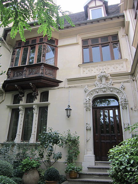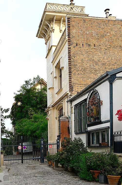 La maison Eymonaud, parfois nommée "Castel Eymonaud", se situe au 7 impasse Marie-Blanche, qui ouvre sur la rue Constance, dans le 18e arrondissement de Paris. Construite entre 1892 et 1897 par l'architecte Joseph-Charles de Montarnal pour l'antiquaire et sculpteur sur bois Ernest Eymonaud, elle a été conçue comme un lieu d'exposition et d'atelier pour ses copies de meubles anciens dans un style néo-gothique pittoresque. L'édifice se distingue par une tour de deux étages, rareté dans ce secteur de Montmartre, et par un décor sculpté aux ouvertures et au bow-window. La maison a été allongée vers l'ouest en 1900 et complétée d'une aile en retour à pans de bois en 1910, qui abritait l'atelier de l'entreprise "À l'Art Ancien". L'implantation et certains éléments architecturaux semblent provenir de l'ancien hôtel de l'Escalopier, construit pour le comte Charles de L'Escalopier et détruit en 1882 ; la présence d'ornements rapportés a pu être due à des achats effectués par Eymonaud. L'Hôtel de L'Escalopier, connu par une lithographie de 1836, comportait une tourelle crénelée, un avant-corps avec terrasse et balcon, ainsi qu'une vaste serre chauffée et une bibliothèque contenant près de 5 000 volumes et un petit musée d'orfèvrerie médiévale. La maison Eymonaud a été protégée au titre des monuments historiques par un arrêté du 14 septembre 1995 pour les façades et toitures de l'ensemble des bâtiments de la parcelle, pour la parcelle elle-même et pour plusieurs éléments intérieurs, notamment le rez-de-chaussée, le premier étage et le grand escalier du bâtiment principal. Sont également visés la tour, l'aile ouest (ancien atelier), le bow-window avec son décor gothique et ses supports sculptés, certains encadrements de fenêtres et la porte d'entrée.