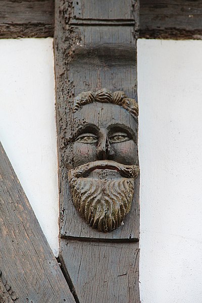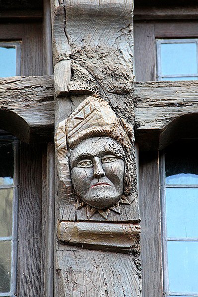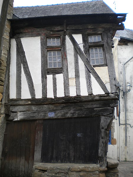 Maison quadrangulaire à pans de bois, ornée d'éléments sculptés. Sa façade sud-est comporte trois larges baies surmontées d'impostes qui étaient fermées par des grilles en bois.