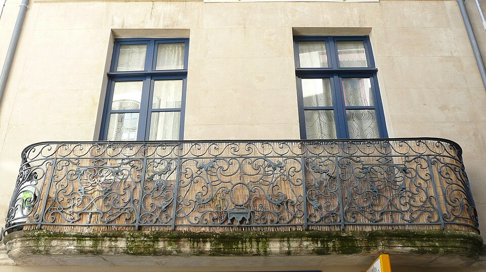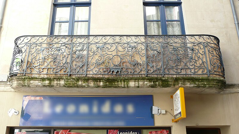 La maison paraît avoir appartenu au chapitre cathédral et aurait peut‑être été comprise dans les grandes répartitions de 1772 concernant les immeubles de la Grande‑Rue dépendant du Chapitre. Au‑dessus d'une devanture de boutique occupant tout le rez‑de‑chaussée, chaque étage est éclairé par deux baies. Au premier étage, ces baies prennent la forme de portes‑fenêtres ouvrant sur un large balcon continu. La partie antérieure, rectiligne, de la ferronnerie se compose de trois panneaux séparés par des pilastres, chacun surmonté d'un encadrement relié à la main‑courante par une série de volutes. Le panneau central, un peu plus long, comporte un médaillon ovale vide, souligné par une draperie de tôle à trois glands et entouré d'un grand fleuron. Les volutes du remplage présentent des formes variées. Les panneaux latéraux reprennent la même composition, mais le médaillon central y est remplacé par deux volutes croisées en X. Les panneaux de retour, cintrés en quart de cercle, se distinguent par un double encadrement qui cerne un grand fleuron constituant le remplage.