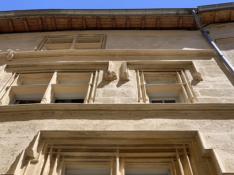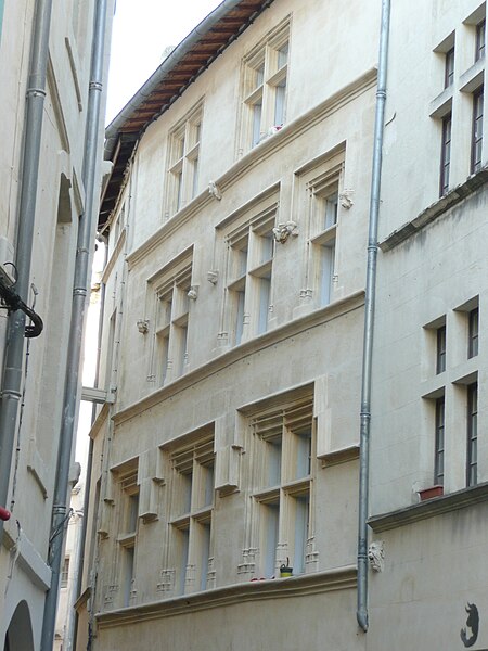 Le propriétaire de la maison est connu depuis 1609. La façade paraît dater du début du XVIe siècle. Elle présente au rez-de-chaussée des boutiques, puis deux grands étages et un demi-étage sous comble. Chacun des deux grands étages est éclairé par trois fenêtres aux axes décalés. Les fenêtres du premier étage ont été rétrécies au XIXe siècle, mais ont conservé leur ancien encadrement intérieur. Les meneaux ont disparu, mais le prolongement latéral de leurs moulures en atteste l'existence. Au deuxième étage, les fenêtres sont plus petites et de largeur inégale. Les moulures saillantes reposent sur des culs-de-lampe sculptés représentant des bustes, des têtes et des anges ailés.