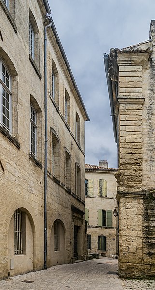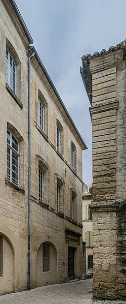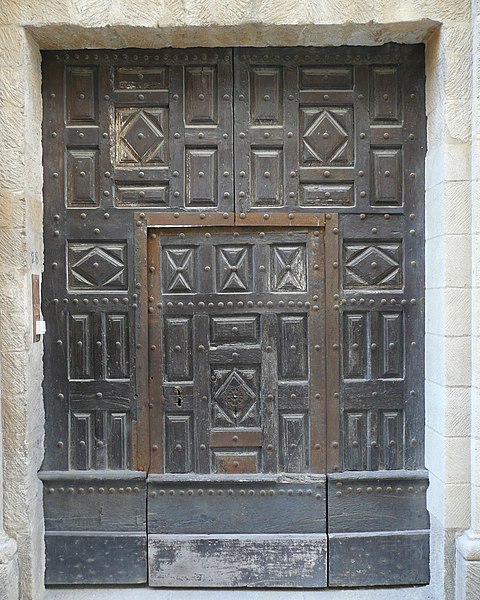 La maison, autrefois hôtel d'Amoreux, famille de conseillers aux comptes, servit de résidence d'été à l'écrivain Jean-Jacques Brousson. Une grande terrasse est aménagée au‑dessus du passage d'entrée et la porte s'ouvre sous cette terrasse. Les vantaux sont composés de petits panneaux de dimensions variées. Au centre du vantail piéton, un panneau carré est subdivisé en un losange central entouré de quatre écoinçons triangulaires, chacun portant un clou à tête travaillée en forme de bourgeon floral. Autour de ce motif, de petits panneaux rectangulaires présentent, en leur centre, un clou à tête ronde, et ces dispositions se répètent sur les vantaux latéraux. Au‑dessus d'une large ligne horizontale de clous marquant l'emplacement des ferrures, les panneaux deviennent moins hauts et plus larges : sur le vantail piéton ils dessinent une croix de Saint‑André, tandis que sur les vantaux latéraux ils forment un losange encadré de quatre triangles. Les mêmes motifs se retrouvent à la partie supérieure des grands vantaux, toujours dans un esprit de symétrie.