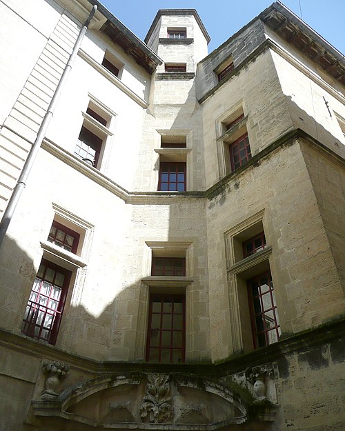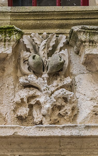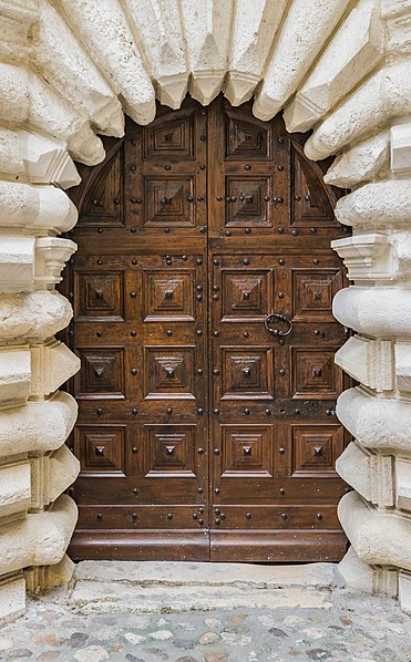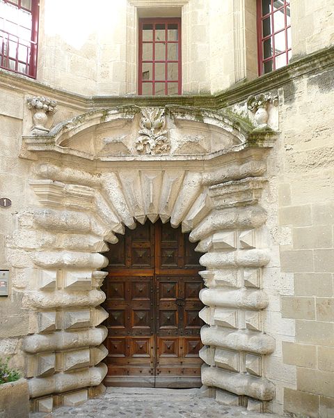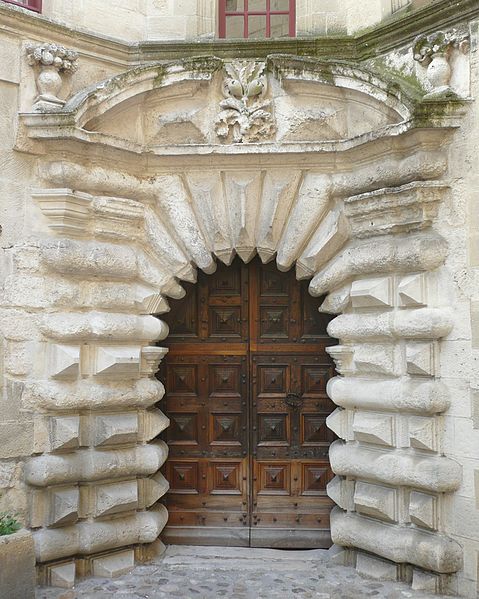 Le portail, de style Louis XIII, est composé en trois pans dont les montants se prolongent obliquement par rapport à l'ouverture. L'appareil en bossage présente des assises taillées alternativement en gros boudins et en pointes de diamant. De longs claveaux, en retour d'équerre, dessinent à l'intrados des segments de cercle qui ferment la baie. Le fronton est orné au centre d'un motif de feuilles découpées, ses extrémités étant amorties par deux vases. Les vantaux, de la même époque que le portail, sont décorés de grandes pointes de diamant taillées à même le bois.