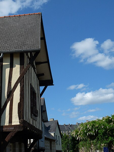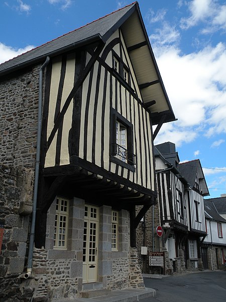 Maison à pignon, avec un étage à pan de bois appuyé sur un rez-de-chaussée en maçonnerie.