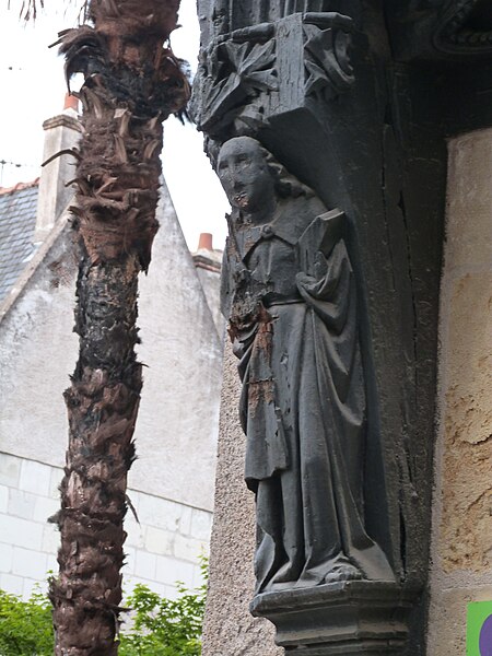 Maison, 32 rue Briçonnet, Tours. Cette ancienne demeure en pierre de taille et pans de bois se situe dans le Vieux-Tours, rue Briçonnet, voie médiévale reliant le secteur de la basilique Saint‑Martin à la Loire ; elle touche presque contiguë l'ancienne église Saint‑Pierre‑le‑Puellier et son ancien cloître. Construite au XVe siècle, la maison a fait l'objet d'une restauration après la Seconde Guerre mondiale. Sa façade, sa toiture et son escalier extérieur ont été inscrits au titre des monuments historiques par arrêté du 22 juin 1946. L'édifice comprend un rez‑de‑chaussée en pierre de taille qui forme une boutique, deux étages et un comble mansardé à pans de bois. Le premier étage est en encorbellement, soutenu par une traverse moulurée reposant sur des consoles en bois sculpté représentant saint Pierre et saint Paul. À l'intérieur, un escalier en bois à balustres moulurés, partiellement fermé, dessert les étages ; les balustres sont ornés de sculptures rappelant celles des culs‑de‑lampe. Avant la restauration, la façade sur rue était revêtue d'un essentage d'ardoises.