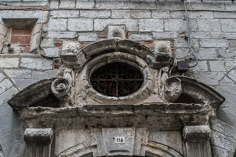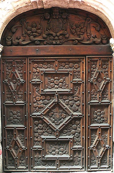 La maison est une grande demeure de la première moitié du XIIIe siècle (?). L'édifice a été très largement remodelé au XVIIe siècle, peut-être pour un Marcilhac. La porte constitue un bel exemple de menuiserie régionale du XVIIe siècle. Les panneaux, tous sculptés, sont encadrés de moulures fixées sur le fond au moyen de gros clous à tête ronde, et un marteau en fer est fixé au‑dessus du panneau central. Au centre du motif sculpté de l'imposte se voit un écusson armorié portant une tête de lion.