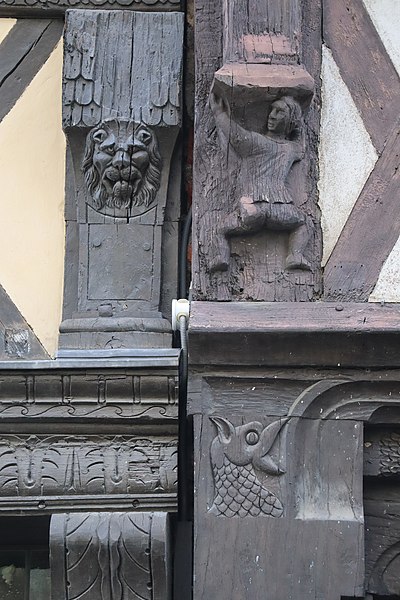 Maison édifiée dans la première moitié du XVIe siècle, la datation dendrochronologique des pans de bois de la façade, réalisée en 1993, la situe autour de 1532. Le sous-sol, plus ancien, pourrait remonter au XIIIe siècle. L'escalier a été reconstruit aux XVIIe ou XVIIIe siècles. Au premier étage, la pièce donnant sur la rue conserve les traces d'une cheminée de la première moitié du XVIIIe siècle et le balcon correspond également à un aménagement de cette période. Les figures sculptées de la façade ont été largement restaurées vers 1900 ; celles du premier étage, auparavant très abîmées, ont été particulièrement retravaillées. La figure d'un homme au poignard pourrait n'être qu'une invention, tandis que l'identification à saint Michel ou saint Georges paraît plus probable. L'édifice a fait l'objet d'une restauration complète en 1993 sous la direction de Pierre Prunet, architecte des Monuments historiques : de nombreuses pièces de bois ont été remplacées. Les sculptures du rez-de-chaussée, représentant une fileuse et un musicien, sont des créations de cette campagne, de même que la reprise des figures du premier étage. Les travaux ont enfin révélé des traces de polychromie, avec du rouge sur les poteaux corniers et la sablière du rez-de-chaussée et du bleu sur les engoulants de ce même niveau.