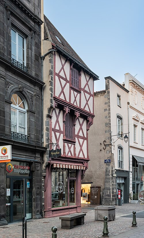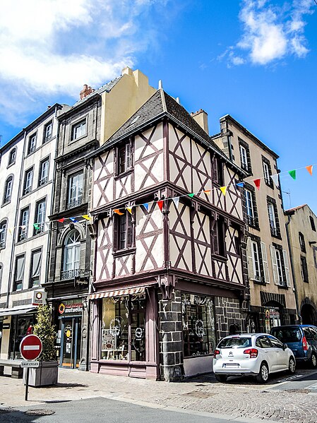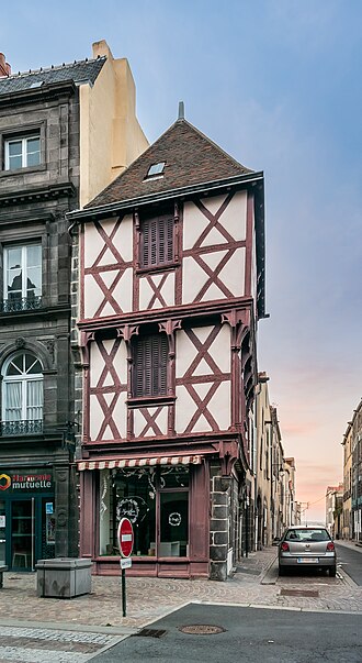 Sauf le soubassement et le mur du fond, la maison est construite en bois et semble être la seule de ce type subsistant à Riom. L'édifice comprend deux étages, le second en léger encorbellement sur le premier. Cet encorbellement repose sur des arcatures à redents qui l'ornent sur tout son pourtour. Dans les parties basses en pierre, de curieuses têtes servent de cul-de-lampe. La maison passerait pour avoir appartenu à Jean Mazuer, jurisconsul de Riom au XVe siècle. Les périodes de construction retenues concernent la façade et, le cas échéant, l'escalier.
