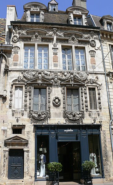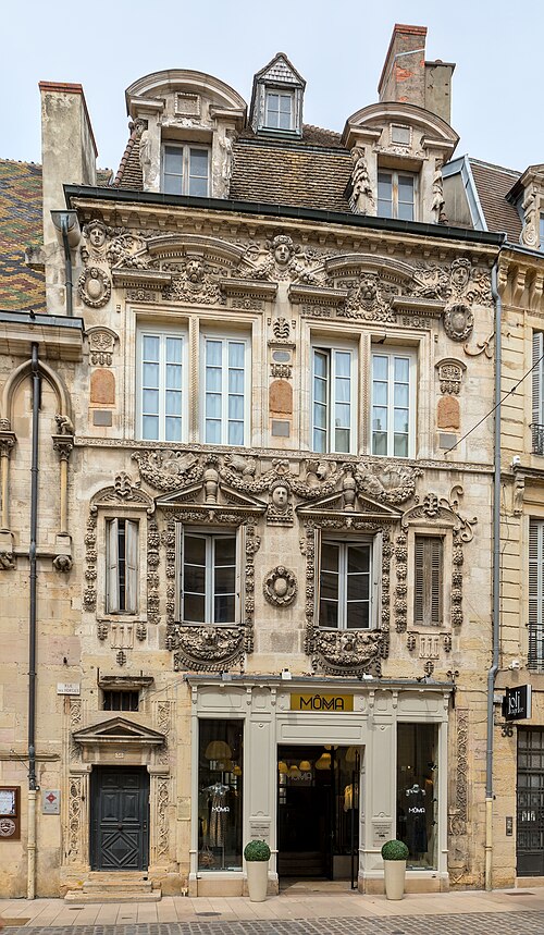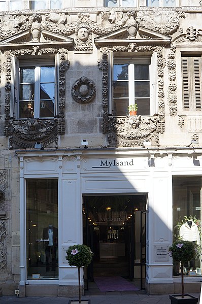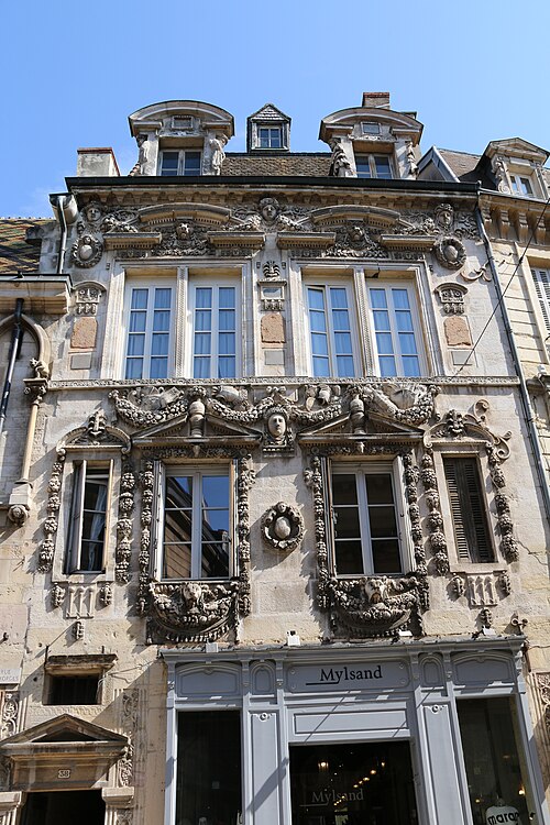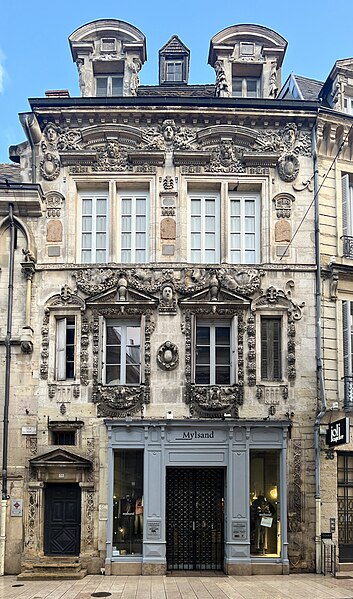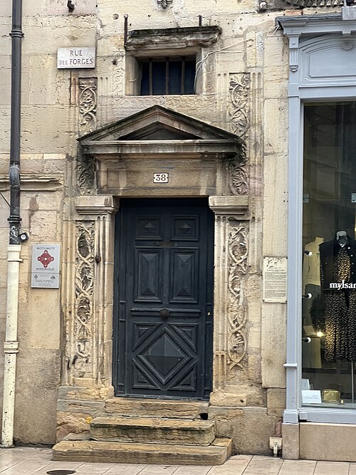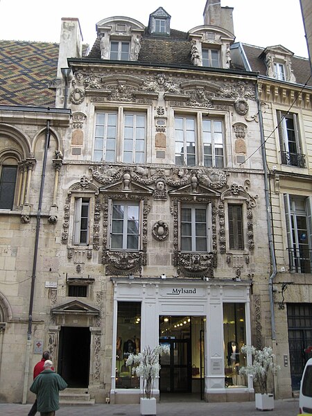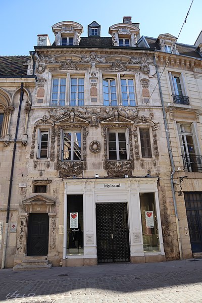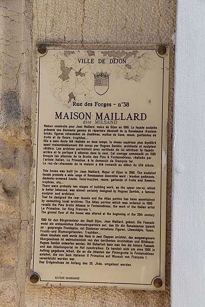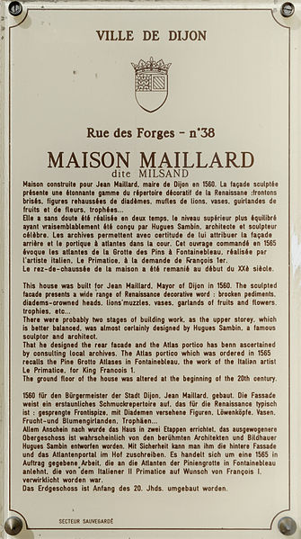 La maison Milsand, dite aussi des Ambassadeurs, située 38 rue des Forges à Dijon, est un hôtel particulier de la Renaissance du XVIe siècle parmi les plus remarquables de la ville. Classé monument historique depuis 1889, cet édifice est parfois appelé maison Maillard. Il fut construit en 1561 pour Jean Maillard, qui fut maire de Dijon de 1560 à 1561, et se distingue par une façade richement sculptée. Le décor du niveau supérieur de la façade et celui de la façade de la cour intérieure sont attribués à l'ébéniste et architecte comtois Hugues Sambin (1520-1601). Au début du XXe siècle, le rez-de-chaussée a été percé pour l'installation d'un coffrage en bois destiné à une boutique. La maison présente une cour intérieure animée par un escalier et des atlantes, et la façade sur la rue des Forges comporte de nombreux détails sculptés visibles de près. Des photographies et des notices sont disponibles sur des ressources telles que Mérimée, Structurae et Wikimedia Commons.