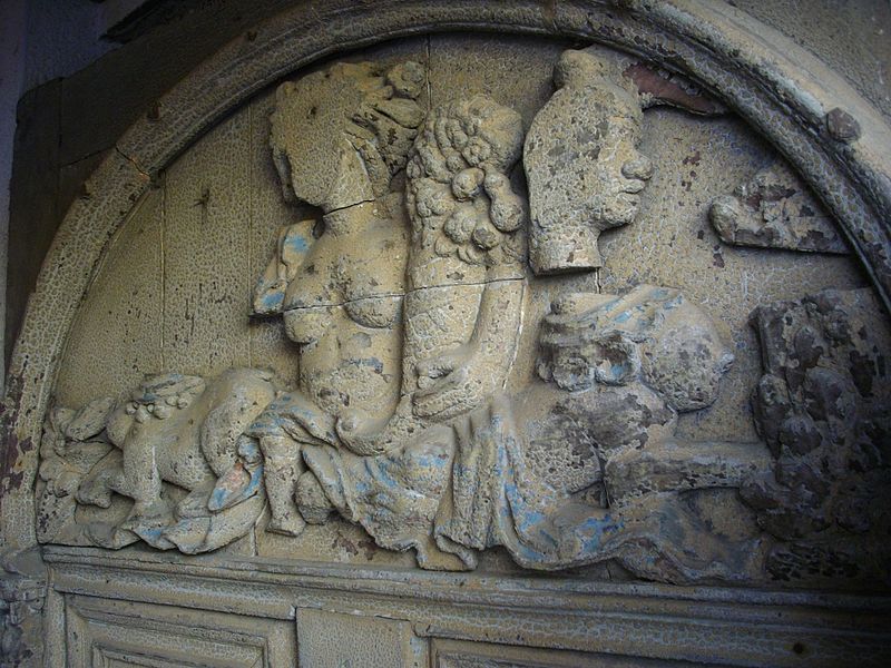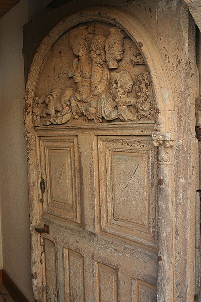 La porte en chêne, à un vantail, est logée dans une baie en plein cintre. Elle comporte quatre panneaux en partie basse et deux panneaux moulurés au-dessus. Le tympan est orné de sculptures représentant un enfant avec une corne d'abondance, assis entre deux chimères.