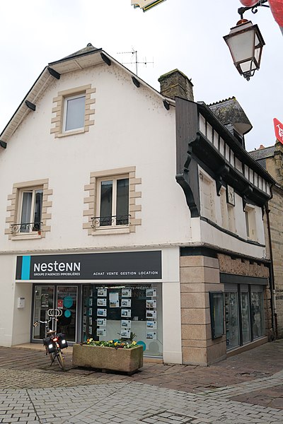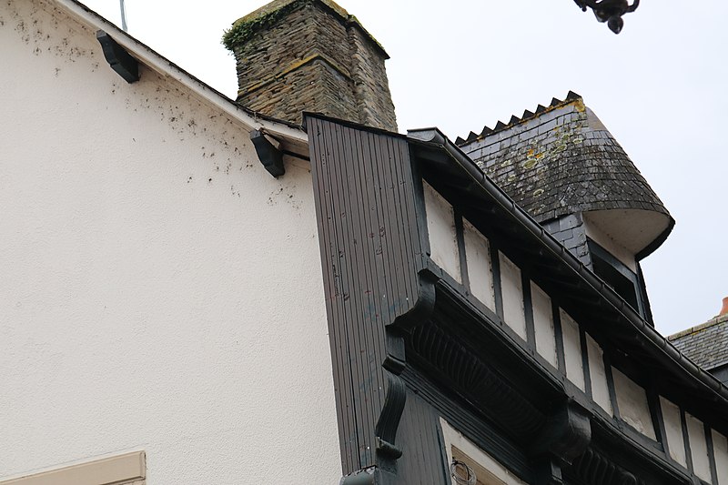 Le premier étage est surmonté d'une grande travée sculptée, ornée de consoles et de pans de bois. La lucarne située au‑dessus est coiffée d'un haut toit d'ardoises en forme d'éteignoir.