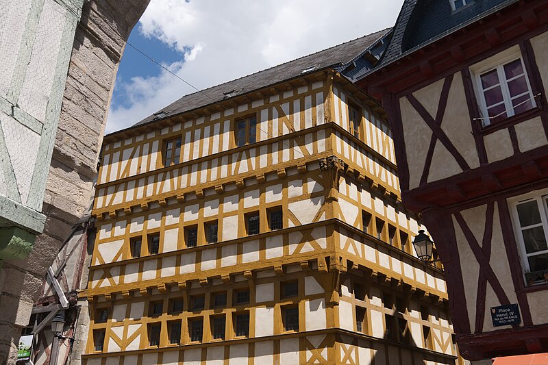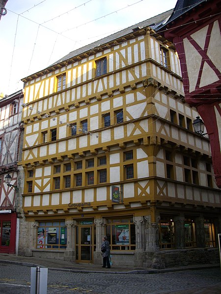 La façade présente des baies en arc surbaissé, profilées de moulures toriques et d’un listel saillant, ornées de petits chapiteaux à feuillages frisés partiellement dissimulés sous des boiseries. Sous les boiseries de la façade sur la place peuvent également apparaître des arcades en pierre sculptée. Le rentier du domaine ducal indique qu’entre 1455 et 1458 l’emplacement est occupé par une maison, avec une cuisine en dépendance, appartenant à Eon Bugaud ; la maison borde au nord la rue aux Asnes et le propriétaire y a fait édifier sa cuisine. Les recherches conduites lors de l’opération de réhabilitation de 1987 à 1991, dirigée par l’architecte Jacques Kervegant, montrent que la maison a été reconstruite dans la seconde moitié du XVe siècle sur l’emplacement d’un édifice plus ancien. Les murs latéraux mitoyens des n°2 et 4 rue Emile Burgault ne correspondent pas aux façades des maisons et pourraient avoir été surhaussés, notamment pour le n°2, en relation avec un édifice antérieur. Lors de la restauration, on a constaté au niveau du sous-sol et du rez-de-chaussée de la façade rue des Chanoines l’existence de corbelets en pierre dont le niveau diffère de celui des planchers en place. Le pignon nord comprend une porte en plein cintre dont la partie haute émerge dans la cave du n°4 ; cette ouverture correspondrait à « l’issue de la dite maison en la rue aux Anes » mentionnée dans les archives. Pour Albert Dégez, la charpente en bois-de-brin, les croix de Saint-André et les encorbellements à galandage rattachent la partie basse de l’édifice au groupe des pans de bois vannetais primitifs, observation confirmée par le rentier. Avant la restauration, la maison présentait des traces d’exhaussement — bois de faible équarrissage et remplacement probable de l’escalier en vis par un nouvel escalier — susceptibles de remonter au XVIIe siècle ; l’édifice d’origine comportait deux étages carrés. Cette surélévation pourrait être liée aux besoins en logements générés par l’installation du parlement de Bretagne à Vannes. Les photographies anciennes montrent l’immeuble enduit avant restauration, avec des boiseries au rez-de-chaussée aménagées pour une boutique. En 1958, l’immeuble a été consolidé par l’adjonction de deux piliers moulurés doublant le mur mitoyen et l’élément d’angle. Lors de la restauration de 1987 à 1991, le choix a été fait de restituer la polychromie du colombage en s’appuyant sur des pigments naturels utilisés à l’époque.