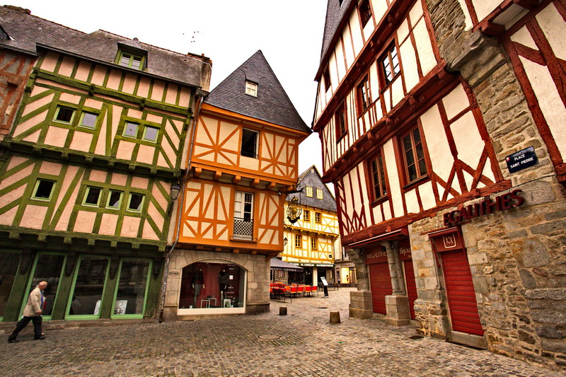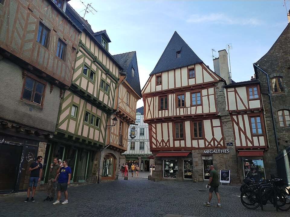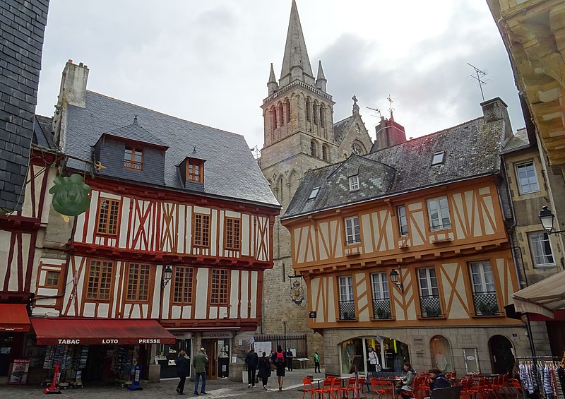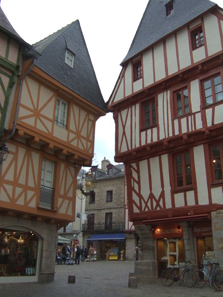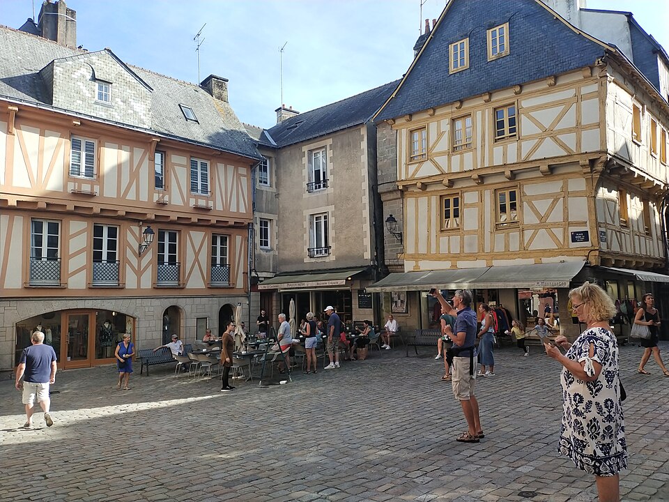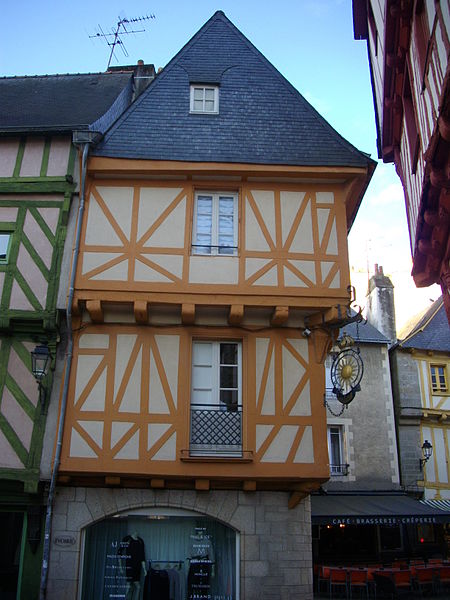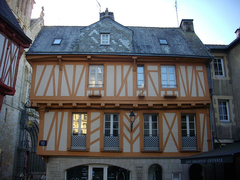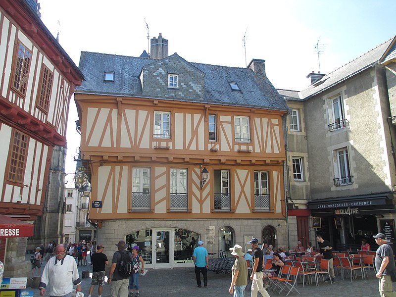 Maison en bois à étages à encorbellement ; le second étage surplombe et forme presque un pont avec celui de la maison située à l’autre angle de la place. À l’origine, il s’agit d’un logis en pan de bois du XVIe siècle, mais la façade, l’ancien mur gouttereau nord, la cheminée et la couverture ont été entièrement repris dans la première partie du XXe siècle ; d’anciennes cartes postales montrent alors un pignon sur rue en pan de bois avec mur latéral, l’ensemble en encorbellement. Le site était occupé à la fin du Moyen Âge, d’après le rentier du domaine ducal 1455-1458, par une maison joignant la Cohue à l’arrière. Lors de la réformation de 1677, la maison appartenait à Julienne du Bois de la Salle, veuve de Jean Sonnic, qui possédait également le 5 rue Saint-Salomon ; les deux maisons portaient le nom de logis Tubaut. Avant la reconstruction par Joseph Heno en 1930, les étals en saillie avaient été supprimés à la demande de Jean Mitaille, instituteur et propriétaire, en 1842, et une devanture de boutique avait été réalisée en aplomb de l’encorbellement existant, sous réserve qu’aucune pièce de charpente ne soit utilisée pour consolider la maison qui n’était pas dans l’alignement. En l’absence de visite intérieure, il est difficile de préciser ce qui subsiste de la maison du XVIe siècle, mais il semble probable que l’ensemble ait été entièrement reconstruit. La maison comporte une cour, aujourd’hui couverte ; cette cour était contiguë à la façade nord du bâtiment des Halles et joignait celle du 5 rue Saint-Salomon.