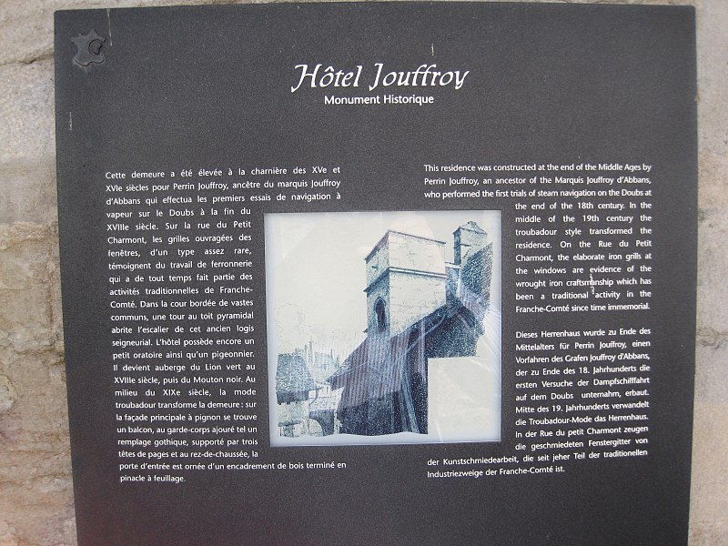 L'hôtel Jouffroy, aussi appelé maison Jouffroy ou hôtel Jouffroy de Luxeuil, est un hôtel particulier situé au 1, rue du grand Charmont, dans le quartier Battant à Besançon (Doubs). Il a été construit entre la fin du XVe et le début du XVIe siècle pour Perrin Jouffroy de Luxeuil, ancêtre du marquis Jouffroy d'Abbans. L'édifice fut élevé à une époque où la Franche-Comté était sous domination des Habsbourg espagnols et où Besançon constituait la seconde ville de la province. L'hôtel appartint à la famille de Jouffroy d'Abans, alors très influente dans la vie locale. Après l'annexion du comté de Bourgogne au royaume de France, la famille perdit progressivement de son influence et l'hôtel fut vendu. Il devint successivement une auberge connue comme l'Auberge du Lion Vert puis l'Auberge du Mouton Noir, puis une pension académique accueillant les enfants de la bourgeoisie et de l'aristocratie. Au XIXe siècle, l'édifice redevint auberge, prit mauvaise réputation et tomba en délabrement avant de rester inoccupé pendant la seconde moitié du XIXe siècle, la Belle Époque et la Première Guerre mondiale. Vers les années 1920, le sous-sol fut investi par une communauté de Russes blancs qui y fondèrent la chapelle orthodoxe russe Saint-Étienne et Sainte-Marie. L'hôtel a été inscrit au titre des monuments historiques le 25 octobre 1937, l'une des premières protections patrimoniales de la ville après les forteresses de Vauban. Ses façades ont été restaurées entre 1989 et 1990 par la Société anonyme immobilière de la Ville de Besançon. La chapelle Saint-Étienne et Sainte-Marie a été restaurée entre 1998 et 2000 et conserve sa vocation cultuelle. Depuis 2000, le corps de logis et les bâtiments nobles abritent l'Agence d'urbanisme Besançon Centre Franche-Comté, tandis que les soubassements et le sous-sol sont occupés par la chapelle et la cour affectée au domaine public artificiel. Sur la rue, les fenêtres du rez-de-chaussée sont protégées par des grilles ferronées ouvragées et une fenêtre en ogive est ornée d'un vitrail, vestige d'un oratoire intérieur. La porte d'entrée présente un encadrement à colonnettes surmonté d'un pinacle à feuillages. Au XIXe siècle, un balcon gothique ajouré, soutenu par trois sculptures de têtes de pages, fut ajouté à l'étage. Dans la cour, l'escalier est abrité par une tour coiffée d'un toit pyramidal.