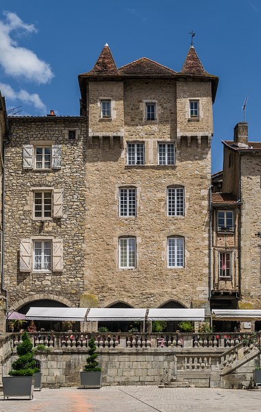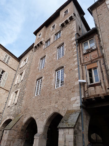 Bastide créée par Alphonse de Poitiers en 1256 en bordure de l'Aveyron, elle devint le siège d'un archiprêtré en 1302 et, en 1463, la sénéchaussée du Rouergue obtint le droit de frapper monnaie royale. Cité de riches marchands, la bastide fut conçue selon les règles habituelles : rues perpendiculaires formant des lots rectangulaires, une place centrale réservée et un terrain destiné à l'église sur un côté de cette place. La place ne fut pas immédiatement bordée d'arcades ; celles-ci se complétèrent au fur et à mesure des demandes de construction. Un incendie en 1497 dévasta la place, ce qui explique l'absence de maisons antérieures au XVIe siècle ; les bâtiments furent rebâtis sur le plan primitif. Cette maison, l'une des plus intéressantes de la place, présente au rez-de-chaussée une boutique ouvrant sur les arcades, deux étages avec des baies à linteau arrondi et, au quatrième étage, deux échauguettes carrées, chacune portée sur quatre corbeaux. Les deux arcades à arc brisé et chanfreinées qui ouvrent sur la place pourraient appartenir à une campagne de travaux du XVe siècle. La maison semble avoir été presque entièrement reconstruite au XVIIe siècle ; les fenêtres à linteaux délardés des deux premiers étages ont probablement été refaites au début du XVIIIe.