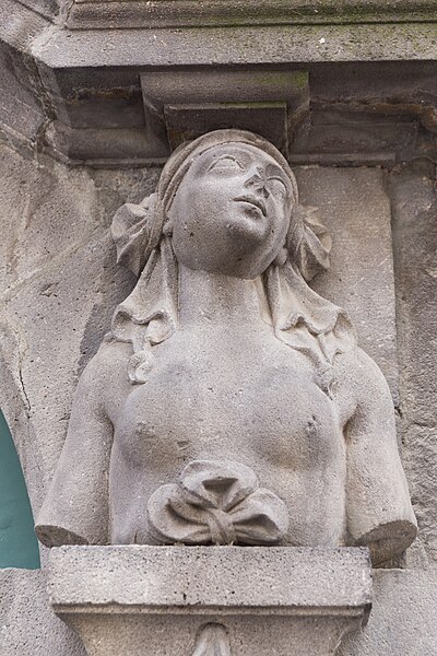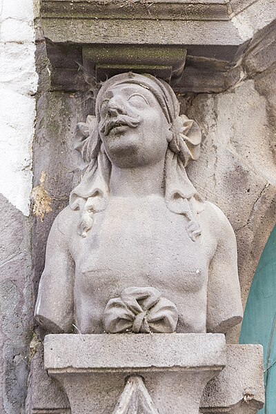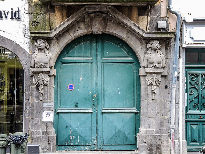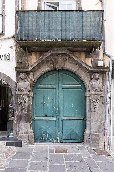 Ancien hôtel Valette de Rochevend, la maison s'ouvre par une porte cochère ornée de deux cariatides. La porte est formée d'un arc en plein cintre surmonté d'un fronton triangulaire. La clé du cintre présente un cartouche qui portait autrefois des armoiries aujourd'hui effacées. Sur des socles entourés de draperies, dont le prolongement en saillie s'applique sur le pied droit de la porte et naît à la hauteur du cintre, se dressent deux bustes, l'un masculin, l'autre féminin. Ces bustes, nus et coiffés d'un linge, soutiennent le départ du fronton qui surmonte l'arc.