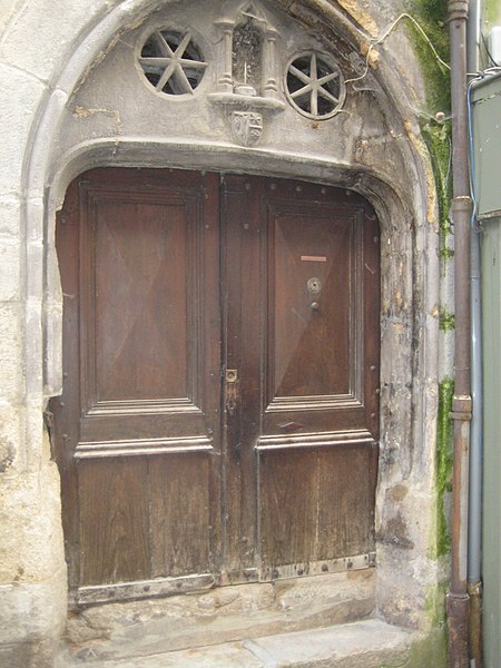 L'entrée conserve un tympan caractéristique d'une époque proche de la Renaissance, orné au centre d'une niche à arc trilobé. Chaque montant est décoré d'une colonnette engagée reposant sur une base prismatique. La petite niche abrite une statuette d'un personnage barbu, drapé, agenouillé et les mains jointes en attitude orante. Sous la niche, un relief représente un écu portant une étoile à six branches, un cep de vigne chargé de grappes et une fleur. De part et d'autre de la niche, le tympan est percé d'ouvertures circulaires à réseau en étoile à six branches. Le reste de la façade est du XVIIIe siècle.