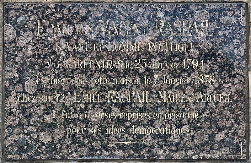 La maison Raspail a été édifiée en l'honneur du scientifique François‑Vincent Raspail (1794–1878), qui y est décédé. Les sources divergent quant à sa date de construction : elles la situent soit au troisième quart du XVIIIe siècle, soit en 1840. En 1856, Émile Raspail, ingénieur, installe avenue Laplace une fabrique de droguerie. François‑Vincent Raspail fait de la maison un lieu de réunion et y vit de 1876 à sa mort en 1878. Une annexe, élevée en 1857 au nord‑ouest de la demeure, est utilisée comme salle de réunion jusqu'à la mort de Raspail ; elle devient bibliothèque à partir de 1881.