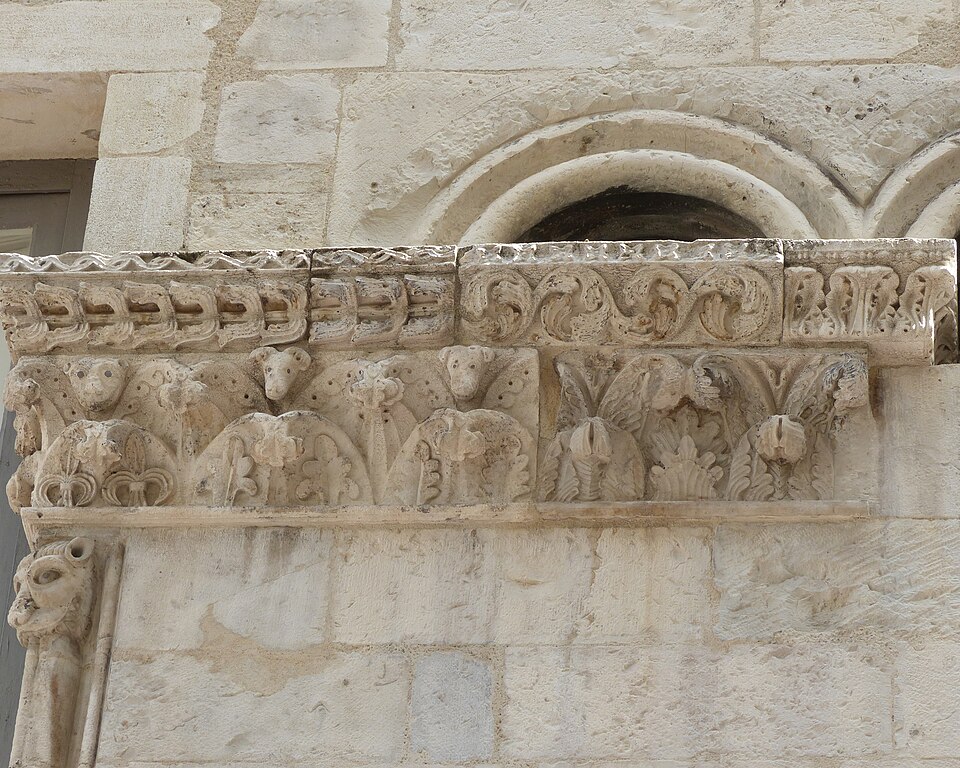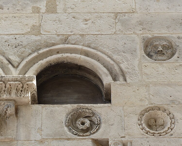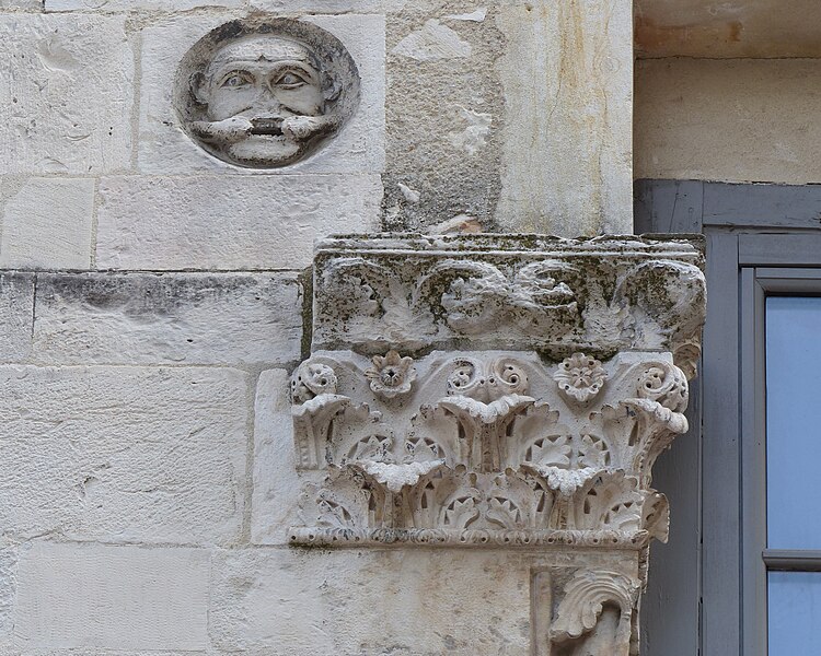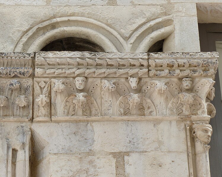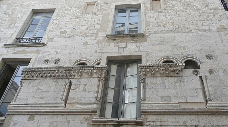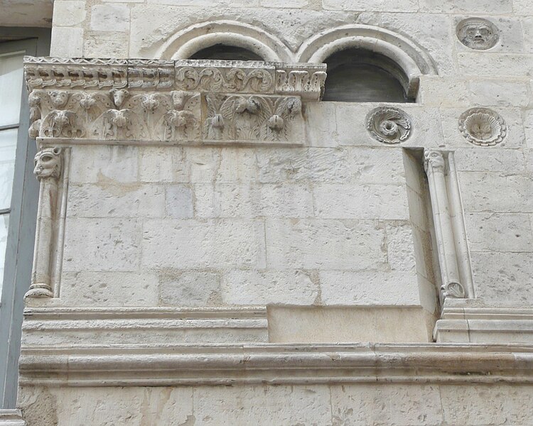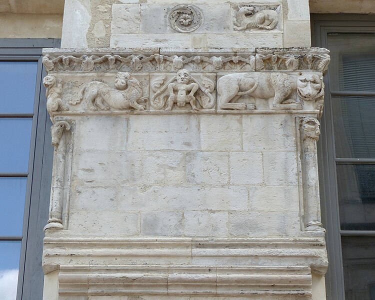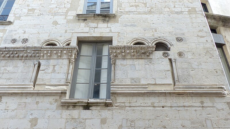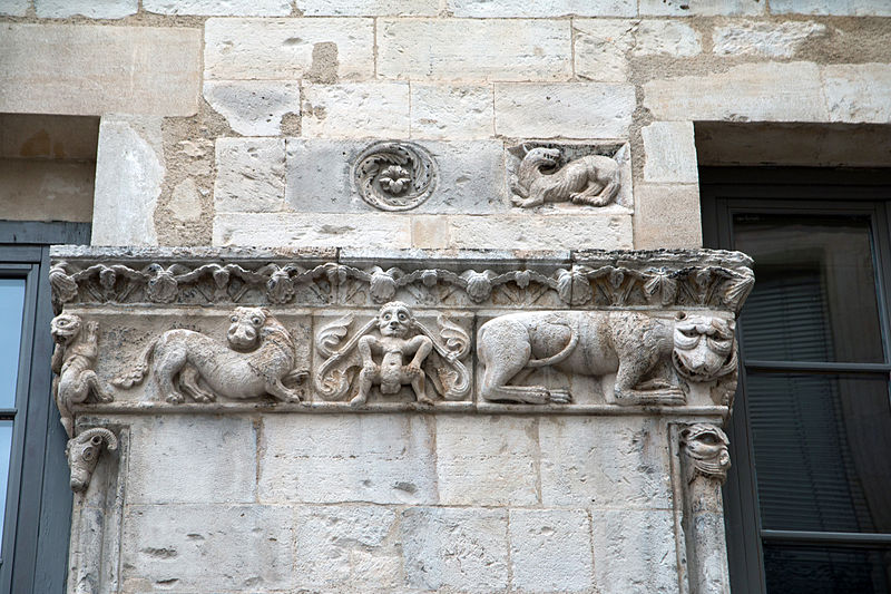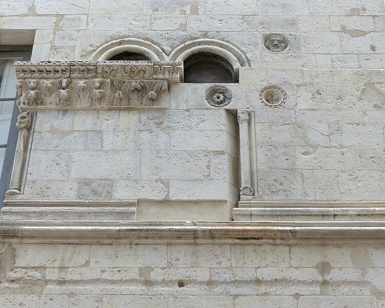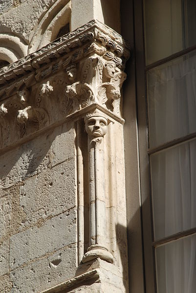 La maison romane de Nîmes, immeuble civil d'époque romane, se situe au 1 rue de la Madeleine, à proximité de la cathédrale Notre-Dame-et-Saint-Castor. Elle est inscrite au titre des monuments historiques depuis 1939. Datée du XIIe siècle, son origine reste incertaine : elle a pu dépendre d'un prieuré ou appartenir à un riche bourgeois. La façade est en pierre de taille assemblée en grand appareil. Le premier étage présente une décoration romane, qualifiée d'« exécution remarquable », composée d'éléments réemployés. Des corniches sculptées formant impostes offrent des ornements variés — feuilles d'acanthe, animaux fantastiques, motifs végétaux, visages humains et têtes d'animaux — tandis que des colonnettes sont surmontées de motifs tels que têtes de bélier, têtes de monstre, aigle ou visage humain. Des cupules au‑dessus des frises présentent des visages moustachus, des feuilles d'acanthe enroulées et des fleurs. On relève aussi des vestiges d'arcs en plein cintre qui permettent de restituer l'élévation romane à baies géminées. Certaines arcades du premier étage ont été bouchées et leurs parois ornées de fragments sculptés réemployés. Les fenêtres actuelles ont été percées au XIXe siècle, lors d'une mise au goût du jour qui a entraîné le déplacement des frises. Les parties hautes de l'élévation ont été reprises au XVIIe siècle, comme l'indique une date relevée dans le mortier lors de restaurations menées en 1999. Dans la cour, une série de quatre balcons superposés subsiste : le premier porte la date de 1637 et le troisième est orné d'une colonnette romane réemployée avec chapiteau.