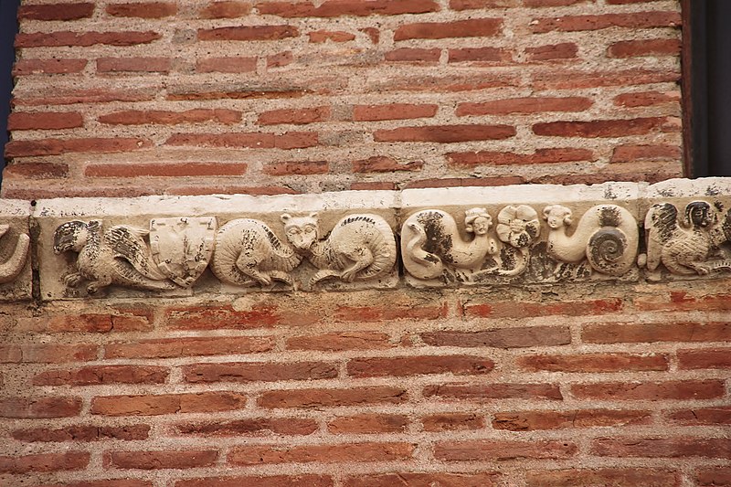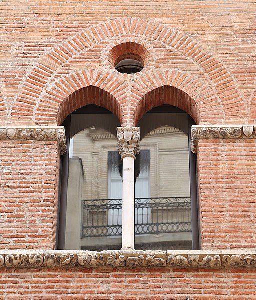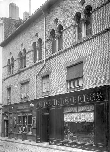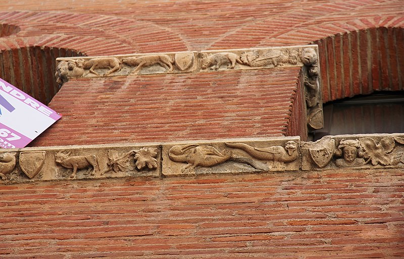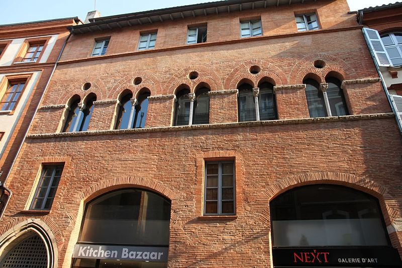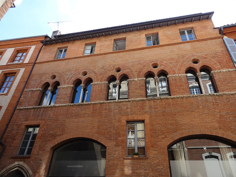 La Maison romano-gothique, située au n°15 de la rue Croix-Baragnon, est l’un des plus anciens immeubles civils de Toulouse et un témoignage rare de l’architecture de transition entre les arts roman et gothique. Construite en briques vraisemblablement au début du XIVe siècle, elle se compose originellement de deux corps accolés : un corps en brique sur la rue et un corps en pan de bois s’ouvrant sur la cour, l’ensemble s’appuyant sur une cave liée à un bâtiment antérieur. La façade sur rue, longue d’environ quatorze mètres et divisée en cinq travées, s’élève sur trois niveaux ; le deuxième étage, qui correspondait au premier niveau habité à l’origine, concentre la décoration sculptée la plus remarquable. Au rez-de-chaussée, la porte en pierre ouvragée en arc brisé donne sur un couloir menant à la cour et à l’escalier desservant les étages ; deux boutiques s’ouvrent à droite par de grandes arcades segmentaires en briques, partiellement restituées lors des travaux de la fin des années 1990. Le premier étage, aménagé au XVIIe siècle au détriment du rez-de-chaussée, a vu l’ouverture de fenêtres rectangulaires qui ont modifié les arcs médiévaux ; certaines de ces fenêtres ont été bouchées lors de la restauration de 1998. Le niveau orné présente cinq baies géminées surmontées d’un arc de décharge brisé évidé d’un oculus ; les baies retombent sur une colonnette centrale dont la base et le chapiteau sont soigneusement sculptés. Les chapiteaux et les bandeaux de pierre offrent un décor foisonnant d’influence romane : visages aux coiffures variées, monstres et créatures hybrides, feuillages, écussons et scènes de musique et de chasse figurent dans un répertoire riche et diversifié. Deux bandeaux sculptés rythment la façade entre les baies et au-dessous de leurs appuis ; ils associent motifs végétaux et vingt-neuf écussons, dont quelques-uns portent des motifs sculptés, et multiplient les représentations d’animaux réels ou fantastiques ainsi que des personnages humains. L’exécution de ces sculptures est attribuée à un atelier d’au moins deux sculpteurs actifs au début du XIVe siècle, dont le style a été rapproché des chapiteaux du triforium de Notre‑Dame du Bourg de Rabastens. À l’intérieur, des peintures murales géométriques contemporaines de la construction ont été mises au jour en 1991 au second étage, confirmant l’ancienneté et la qualité du décor. La maison a connu plusieurs remaniements : au XVIIe siècle le corps sur cour a été reconstruit en briques et la distribution intérieure modifiée, tandis que la façade arrière date de cette campagne de travaux. Le logis, qui dépendait auparavant d’un ensemble plus vaste incluant les numéros voisins, apparaît dans les sources avec un premier propriétaire identifié en 1477, Jacques Bénazet ; il appartient ensuite à des membres de la famille Benoist puis passe par alliances et ventes à divers propriétaires, la maison étant fragmentée entre plusieurs propriétaires dès 1650. Au XVIIe siècle l’édifice entre dans la famille d’Aldéguier, puis change de mains au XVIIIe siècle; l’un des héritiers, Clément‑Marie Leblanc, est mentionné jusqu’à la Révolution. Un troisième étage a été ajouté en 1923, et la suppression des devantures de bois au rez-de-chaussée vers 1945 a dégagé les arcades. Des recherches menées à partir de 1990 ont permis de redécouvrir les fresques médiévales et de réévaluer les aménagements des XVIIe et XIXe siècles ; l’ensemble du bâtiment a fait l’objet d’un classement étendu à la fin des années 1990 et d’une campagne de restauration destinée à restituer l’apparence médiévale de la façade sur rue.