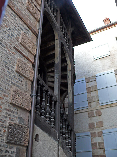 Le bâtiment présente des pignons et des coursives en pans de bois. On accède aux étages par un escalier en vis en grès, entièrement restauré, dont la tourelle est reliée à la maison par trois niveaux de galeries couvertes à balustrades en bois.