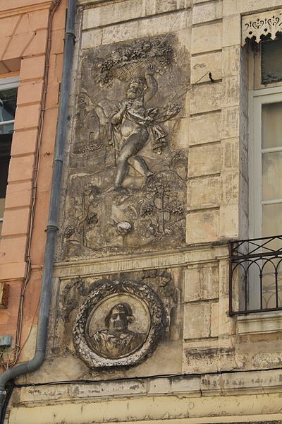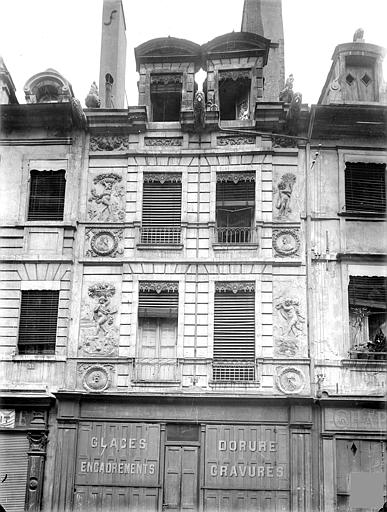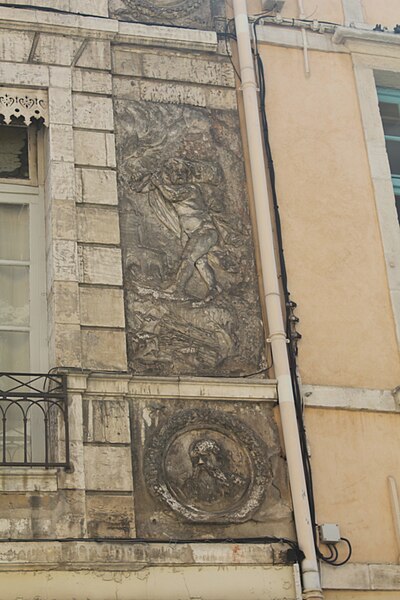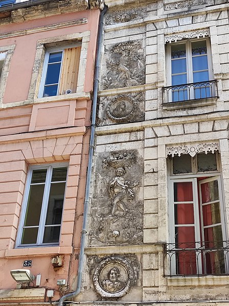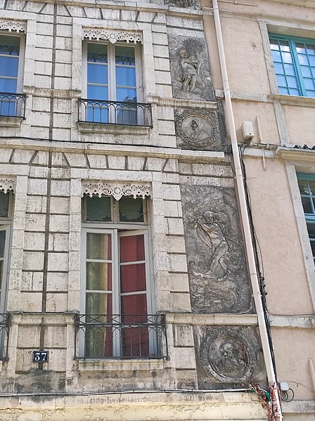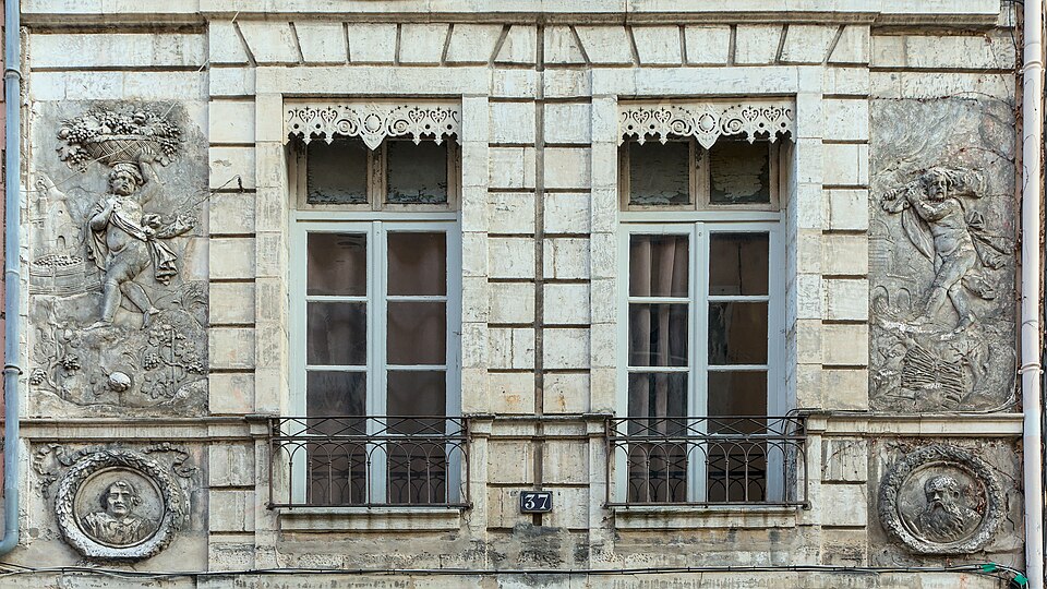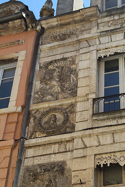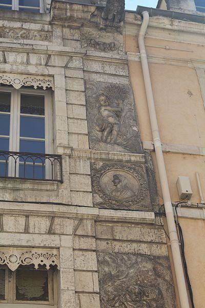 La façade est ornée de bas-reliefs en plâtre figurant les quatre saisons, chacune personnifiée par un amour tenant un attribut : le Printemps, en haut à gauche, porte une couronne ou un bouquet de fleurs ; l’Été, en haut à droite, tient une gerbe de blé ; l’Automne, en bas à gauche, est associé à des fruits ou des grappes de raisin ; l’Hiver, en bas à droite, porte un fagot de bois. Quatre visages en médaillon semblent représenter des portraits de membres de la famille.