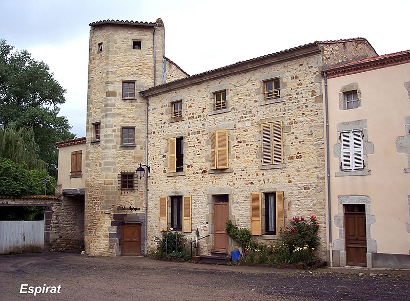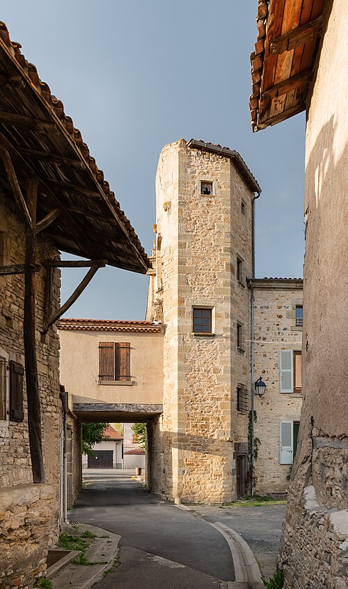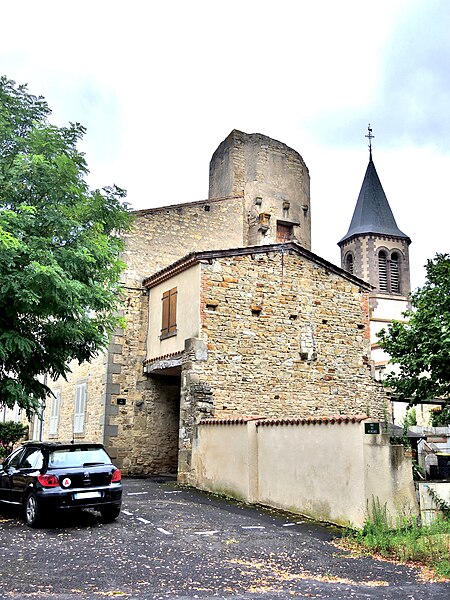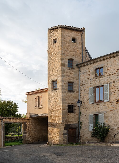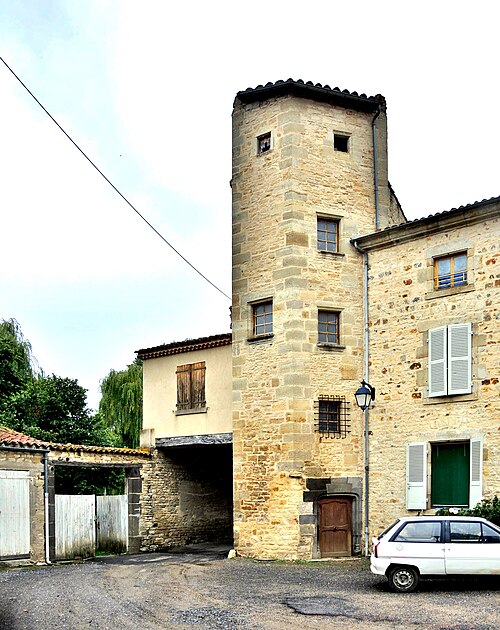 Adossée à l'ancienne courtine, la maison conserve une tourelle d'escalier polygonale du XVe siècle, installée à l'emplacement de l'ancienne porte fortifiée qui desservait la forteresse au nord-ouest. Il s'agit d'une tourelle hexagonale à pans coupés renfermant un escalier à vis. Sur la face ouest, au niveau du premier étage, une petite construction portée par des poutres en bois surmonte un passage qui ouvre sur la place de l'Église. Ce passage était primitivement voûté en plein cintre ; la voûte soutenait une construction assez élevée aujourd'hui démolie, dont subsistent notamment les vestiges d'une cheminée de la Renaissance.