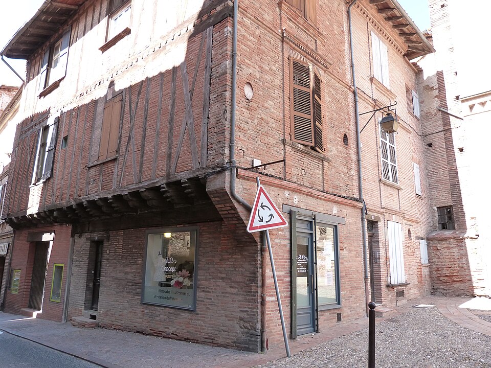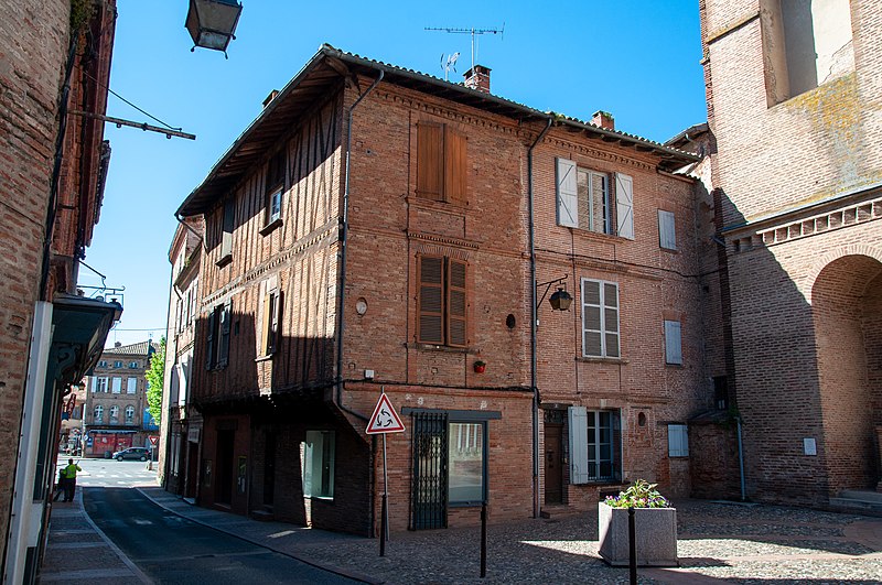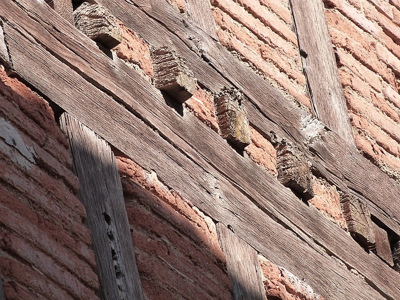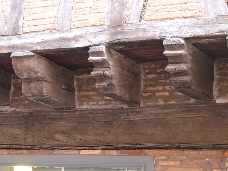 Immeuble rectangulaire dont la façade principale est en encorbellement. Les poutrelles qui soutiennent l'encorbellement du premier étage sont moulurées selon deux types distincts, probablement liés à une ancienne réparation : l'un présente deux quarts-de-rond profilés chacun avec un listel, l'autre se compose de trois boudins profilés en amande reliés par des gorges. Le pan de bois, porté par ces poutrelles, s'élève verticalement sur deux niveaux sans saillie supplémentaire à la base du deuxième étage. Entre ces niveaux, les sablières encadrant les embouts des sommiers dessinent un double bandeau horizontal. Les panneaux du colombage alternent croix de Saint-André et panneaux rectangulaires pourvus d'une armature verticale médiane. Les briques sont posées en lits horizontaux et les rares fenêtres s'insèrent dans le colombage. À l'extrémité gauche de la façade, l'angle a été renforcé par un pan de bois composé d'une série de panneaux en croix de Saint-André. Bien que les moulurations des poutrelles soient d'inspiration gothique, la construction n'est probablement pas antérieure au XVIe siècle.