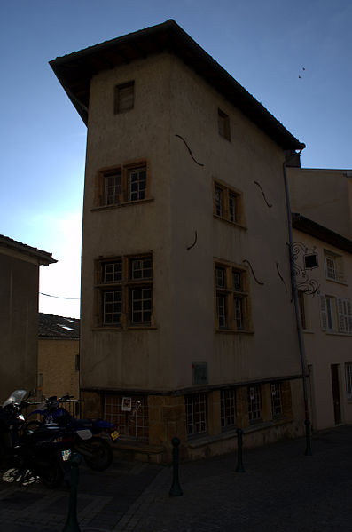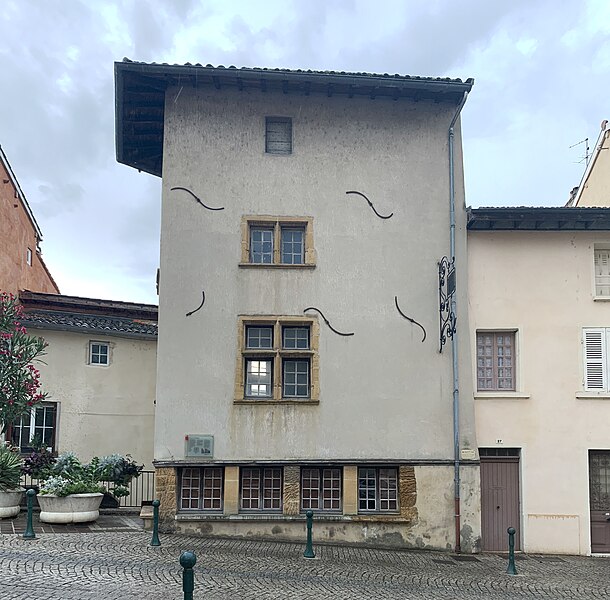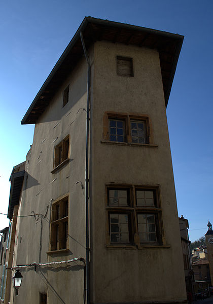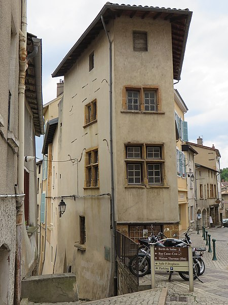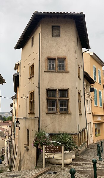 La Maison Thermac, située intra muros à Trévoux (Ain), a probablement été bâtie à la fin du XVe ou au début du XVIe siècle. Elle conserve sa structure d’origine et présente des vestiges d’éléments défensifs côté rue Casse‑cou. Une surélévation possible au début du XIXe siècle a ajouté un étage avec des fenêtres en calcaire gris, et les baies du premier niveau sur la Grande Rue ont été remaniées vers 1960. Un procès‑verbal de 1770 la signale comme ancienne mais solide. Elle figure sur le plan d’alignement de 1777 — où est représenté, devant le pan coupé, le puits de quartier — sur le plan cadastral de 1823 et existait encore au début du XXe siècle. L’édifice a fait l’objet d’une inscription partielle au titre des monuments historiques en 1933 (façades et toitures) et porte une indication manuscrite de restauration datant de 1967.