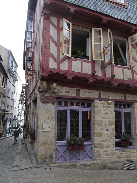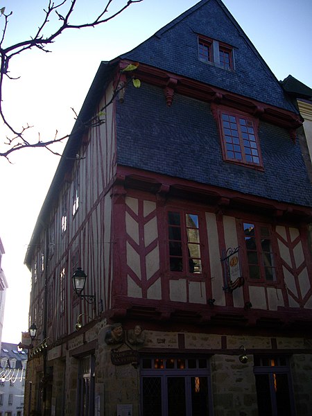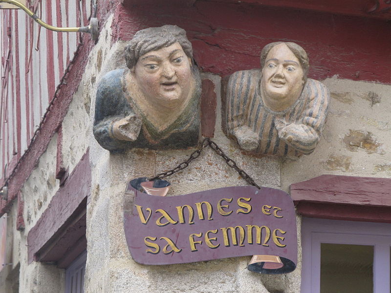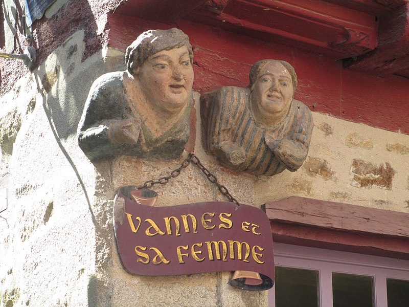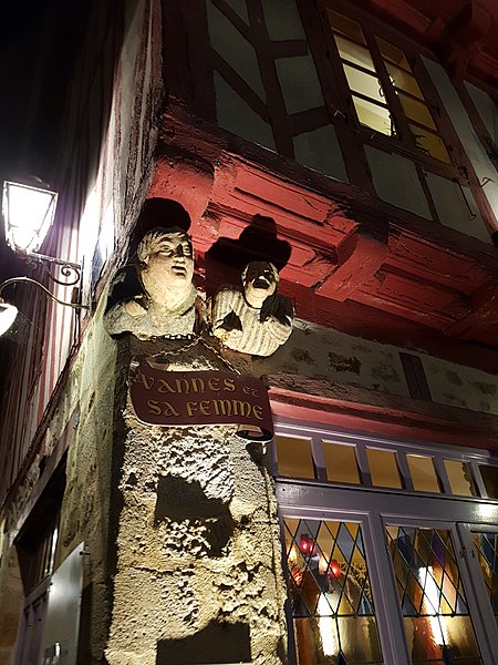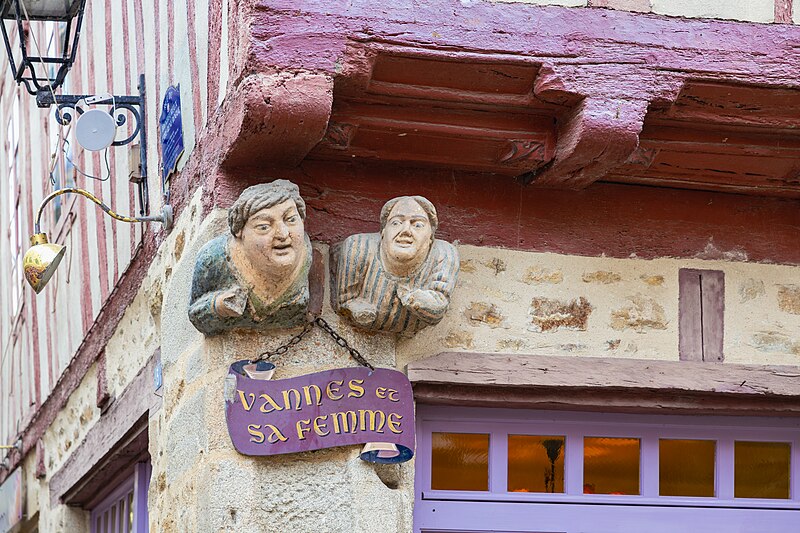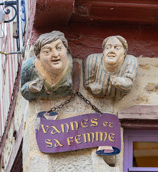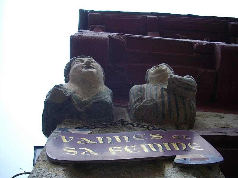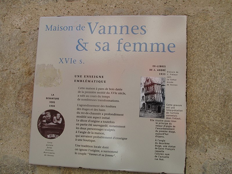 Maison à pans de bois à étages dont les niveaux supérieurs surplombent la rue et dont l'armature est apparente. Les poutres moulurées et sculptées décorent les trois étages et une statuette sculptée de franciscain se trouve sous les combles. Le second étage et le pignon sont revêtus d'ardoise. Au rez-de-chaussée, en encoignure, deux bustes en pierre sculptée représentent un bourgeois de Vannes et sa femme. L'enseigne dite «Vannes et sa femme» tient son nom de ces célèbres ronde-bosses encastrées sur la façade nord. Une déclaration de 1677 pour Julienne Ehanno, compagne de Jean Queneau sieur de Lormouet, mentionne la maison ouvrant alors sur la rue de «La Laiterie», aujourd'hui rue du Bienheureux Pierre René Rogue, avec une cour correspondant à la cour actuelle, une buanderie — d'où la présence d'un puits — et une écurie. Les caractères du pan de bois, malgré des remaniements, font remonter la maison au XVIe siècle, même si le rentier du domaine ducal de 1455-1458 signale déjà une maison à cet emplacement appartenant à Jehan Guillemoto. La cheminée à colonnettes du premier étage relève d'un modèle du XVIe siècle. L'escalier tournant à retours, avec jour, remplace sans doute au XVIIe siècle l'escalier primitif, probablement en vis. La façade en pan de bois porte des traces de reprise : l'encorbellement a été refait et un étage a été ajouté, réduisant la hauteur de l'ancien étage carré. Les têtes de poutre reposent désormais sur de petites pièces horizontales insérées entre deux poteaux et sont soutenues par des poteaux supplémentaires visibles en façade, vestiges de cette opération. Au XIXe siècle, le partage de la moitié sud du rez-de-chaussée avec le n°1 de la rue explique la demande de Perrine Gicquel d'élever jusqu'au 2e étage un pan de bois sur le mur de clôture de la cour, ce qui justifie l'augmentation vers le sud de la façade est et l'existence d'une galerie sur cour. Les clichés anciens montrent l'existence de deux boutiques séparées par des vitrines et des accès différents ainsi que la porte qui donne aujourd'hui sur le restaurant et l'escalier du XVIIe siècle, et l'épaisseur du mur peut traduire une séparation entre deux logis. La sculpture «Vannes et sa femme» est une enseigne en granite polychrome, probablement du XVIe siècle, constituée de deux bustes côte à côte — la femme à gauche et l'homme à droite — aux visages joviaux et très expressifs. Leurs mains, aujourd'hui amputées, ont peut-être tenu des objets. Ces bustes, hauts de quelques dizaines de centimètres, émergent de l'angle de la maison située au 3, rue du Bienheureux Pierre-René Rogue, à l'angle de la rue Noé, dans le coin sud-ouest de la place Valencia. La façade et la toiture de cette maison, datées des XVe et XVIe siècles et ayant appartenu à Gilles de Bretagne, ont été inscrites aux Monuments historiques en 1929. L'origine de l'enseigne reste mystérieuse, mais son surnom est attesté dès le début du XIXe siècle. Au printemps 2010, un fragment de la tête de l'homme s'est détaché, conduisant les services des Bâtiments de France à découper la partie supérieure du crâne pour la remplacer. La signification de la sculpture est inconnue : elle pourrait être une enseigne commerciale, peut-être pour un cabaret, ou entretenir un lien avec le Château-Gaillard situé en face, ou avec une famille locale nommée Vennes. Des couples sculptés comparables existent ailleurs dans le Morbihan, notamment à Landévant, Questembert (hôtel Belmont), Malestroit, Limerzel et Pontivy, où ils portent des surnoms analogues. Source : Portail de Vannes et de sa région.