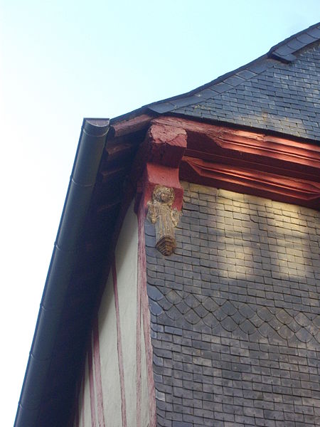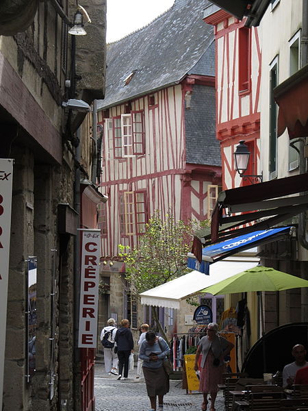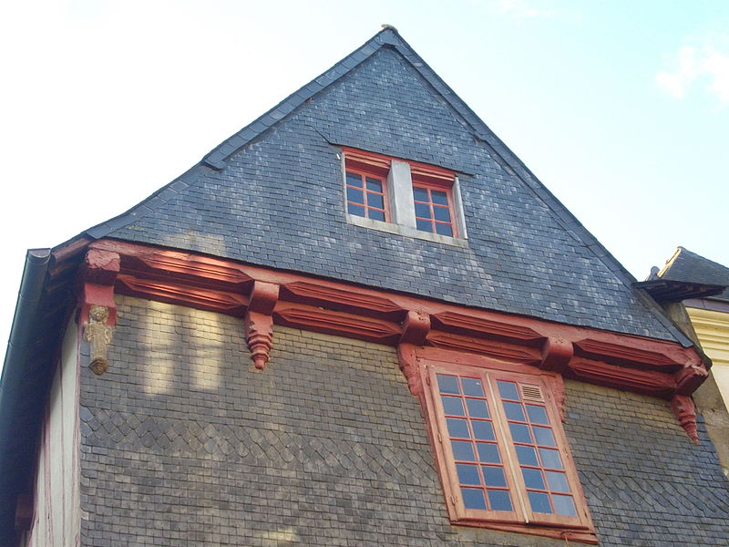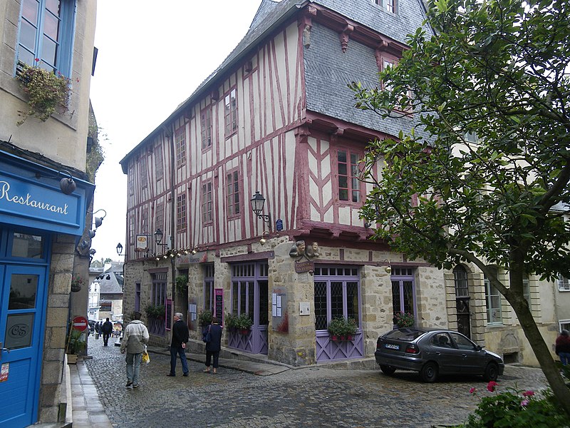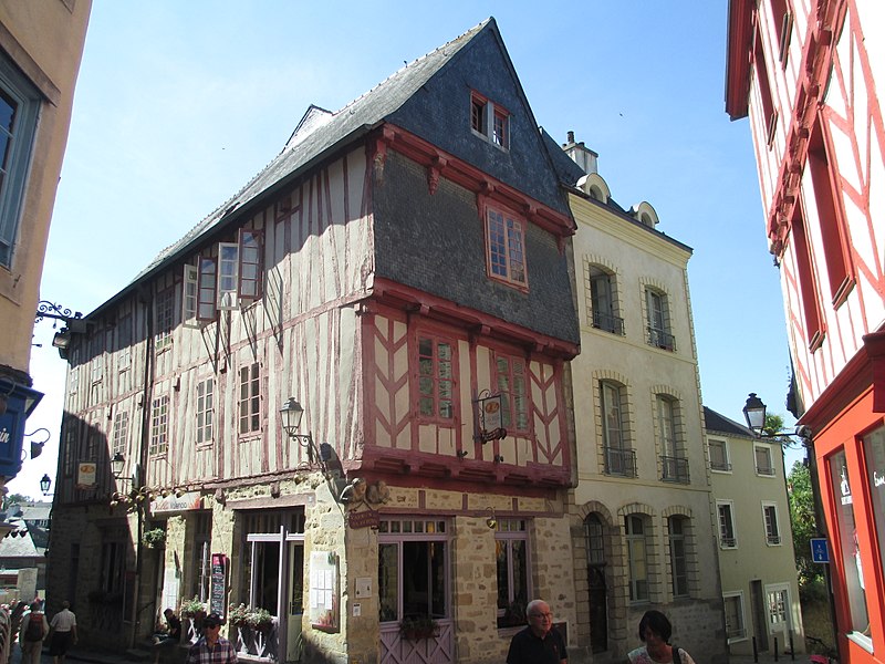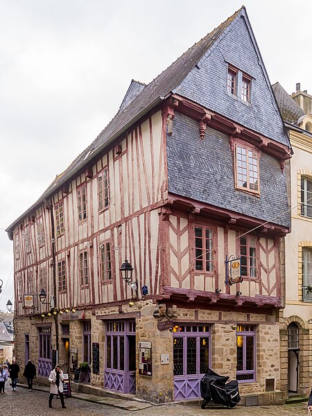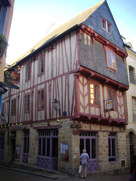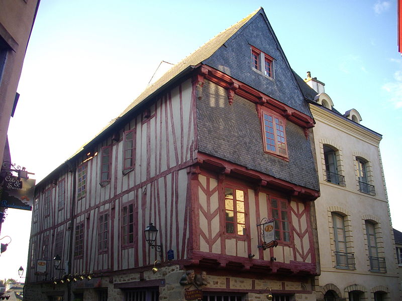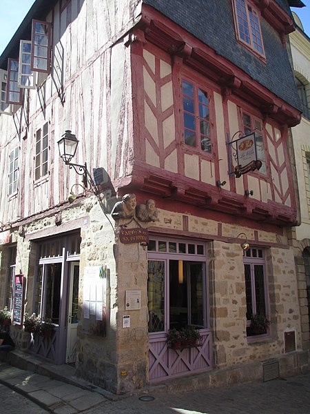 Maison à pans de bois à étages dont les niveaux supérieurs surplombent la rue et dont l'armature est apparente. Les poutres moulurées et sculptées décorent les trois étages et une statuette sculptée de franciscain se trouve sous les combles. Le second étage et le pignon sont revêtus d'ardoise. Au rez-de-chaussée, en encoignure, deux bustes en pierre sculptée représentent un bourgeois de Vannes et sa femme. L'enseigne dite «Vannes et sa femme» tient son nom de ces célèbres ronde-bosses encastrées sur la façade nord. Une déclaration de 1677 pour Julienne Ehanno, compagne de Jean Queneau sieur de Lormouet, mentionne la maison ouvrant alors sur la rue de «La Laiterie», aujourd'hui rue du Bienheureux Pierre René Rogue, avec une cour correspondant à la cour actuelle, une buanderie — d'où la présence d'un puits — et une écurie. Les caractères du pan de bois, malgré des remaniements, font remonter la maison au XVIe siècle, même si le rentier du domaine ducal de 1455-1458 signale déjà une maison à cet emplacement appartenant à Jehan Guillemoto. La cheminée à colonnettes du premier étage relève d'un modèle du XVIe siècle. L'escalier tournant à retours, avec jour, remplace sans doute au XVIIe siècle l'escalier primitif, probablement en vis. La façade en pan de bois porte des traces de reprise : l'encorbellement a été refait et un étage a été ajouté, réduisant la hauteur de l'ancien étage carré. Les têtes de poutre reposent désormais sur de petites pièces horizontales insérées entre deux poteaux et sont soutenues par des poteaux supplémentaires visibles en façade, vestiges de cette opération. Au XIXe siècle, le partage de la moitié sud du rez-de-chaussée avec le n°1 de la rue explique la demande de Perrine Gicquel d'élever jusqu'au 2e étage un pan de bois sur le mur de clôture de la cour, ce qui justifie l'augmentation vers le sud de la façade est et l'existence d'une galerie sur cour. Les clichés anciens montrent l'existence de deux boutiques séparées par des vitrines et des accès différents ainsi que la porte qui donne aujourd'hui sur le restaurant et l'escalier du XVIIe siècle, et l'épaisseur du mur peut traduire une séparation entre deux logis. La sculpture «Vannes et sa femme» est une enseigne en granite polychrome, probablement du XVIe siècle, constituée de deux bustes côte à côte — la femme à gauche et l'homme à droite — aux visages joviaux et très expressifs. Leurs mains, aujourd'hui amputées, ont peut-être tenu des objets. Ces bustes, hauts de quelques dizaines de centimètres, émergent de l'angle de la maison située au 3, rue du Bienheureux Pierre-René Rogue, à l'angle de la rue Noé, dans le coin sud-ouest de la place Valencia. La façade et la toiture de cette maison, datées des XVe et XVIe siècles et ayant appartenu à Gilles de Bretagne, ont été inscrites aux Monuments historiques en 1929. L'origine de l'enseigne reste mystérieuse, mais son surnom est attesté dès le début du XIXe siècle. Au printemps 2010, un fragment de la tête de l'homme s'est détaché, conduisant les services des Bâtiments de France à découper la partie supérieure du crâne pour la remplacer. La signification de la sculpture est inconnue : elle pourrait être une enseigne commerciale, peut-être pour un cabaret, ou entretenir un lien avec le Château-Gaillard situé en face, ou avec une famille locale nommée Vennes. Des couples sculptés comparables existent ailleurs dans le Morbihan, notamment à Landévant, Questembert (hôtel Belmont), Malestroit, Limerzel et Pontivy, où ils portent des surnoms analogues. Source : Portail de Vannes et de sa région.