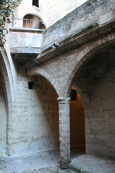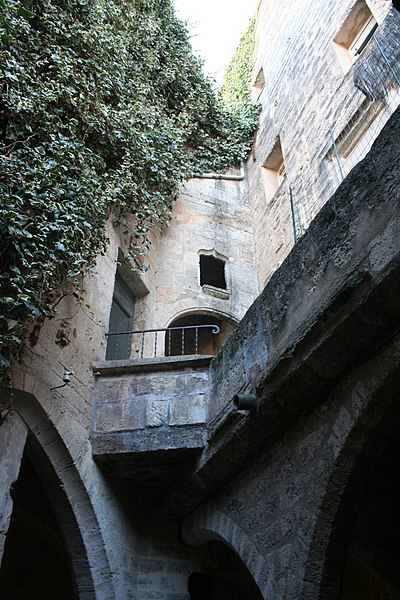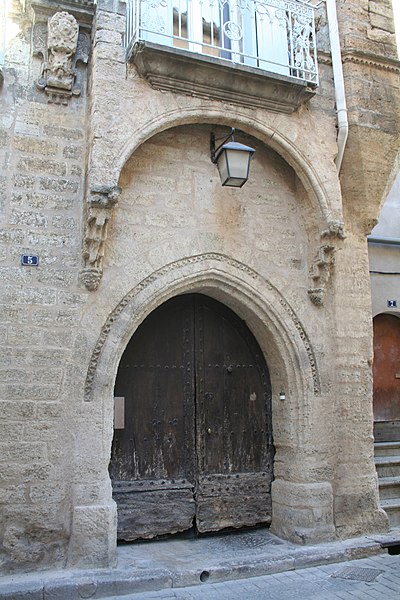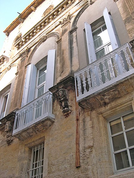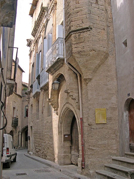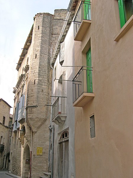 Les Bénédictins de la Chaise-Dieu furent les seigneurs justiciers de Poussan depuis la fin du XIe siècle. À partir du XVIe siècle, de nombreux coseigneurs firent édifier dans le village des résidences plus ou moins ornées. Pour cette maison, la décoration de la façade paraît avoir été appliquée sur une construction bien antérieure. À l'angle droit de la façade, une porte et une tourelle semblent remonter au XIVe siècle. La porte en arc brisé est défendue par une bretèche ornée de têtes couronnées, orientées de trois quarts vers l'intérieur. Le bandeau de la tourelle conserve son profil gothique, tandis que l'archivolte en arc brisé de la porte a été chargée d'un décor en pointes de diamant. L'ensemble illustre l'adaptation d'une façade gothique au goût classique, avec la volonté manifeste de limiter les dépenses de gros œuvre.