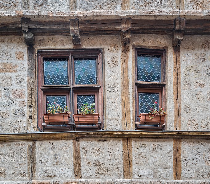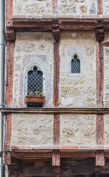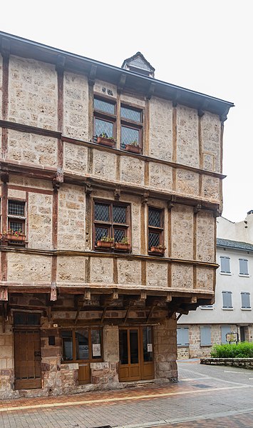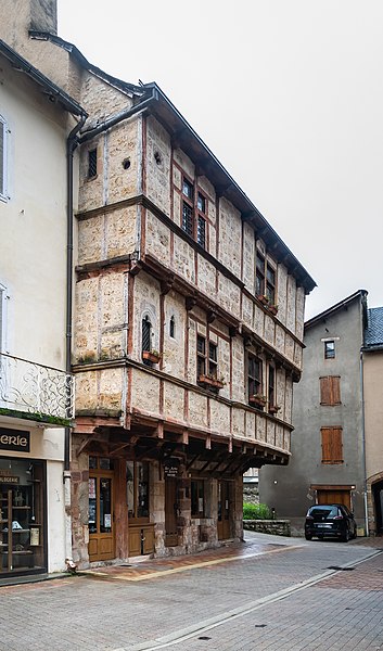Ces deux maisons accolées, situées le long de la place d’une ville royale depuis la seconde moitié du XIIIe siècle, présentent une longue façade encorbellée et un retour vers l'ouest jusqu'au passage anciennement appelé béal du moulin. Elles appartiennent au groupe des pans de bois à panneaux d'étage : les deux niveaux portent une sablière et des solives qui forment l'encorbellement, tandis que le remplissage est en tuf local. La travée d'angle Est conserve des éléments d'architecture médiévale — une baie à remplage trilobé et un oculus à remplage quadrilobé — attribuables à la fin du XIVe ou au début du XVe siècle, bien que ces éléments puissent être des remplois. Le rez-de-chaussée, en grès avec des encadrements en grès rose, semble avoir été consacré aux boutiques ; le premier étage abrite la grande pièce et le second les chambres. L'intérieur conserve des cheminées. La maison, partiellement en pans de bois adossée à des constructions plus anciennes en pierre, est datée du XIVe ou du XVe siècle.