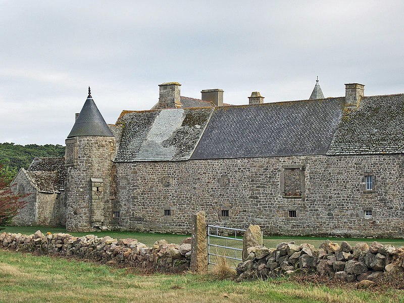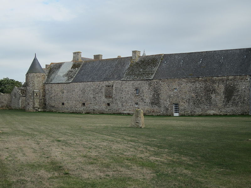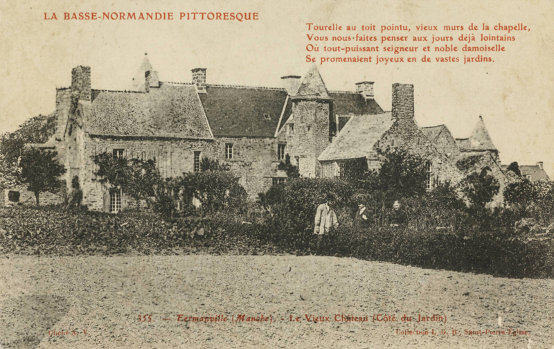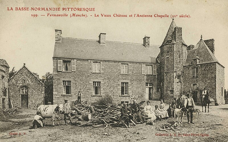 Selon la tradition locale, un château se serait jadis élevé au roc du Castel, sur le rivage de l'anse de la Mondrée ; l'actuel manoir d'Inthéville se trouve cependant un peu en retrait, au hameau de la Cour d'Inthéville, à 1,1 kilomètre au nord-est de l'église Saint-Martin de Fermanville. Le vocable « cour » atteste la présence, depuis l'époque féodale, d'une curtis, résidence seigneuriale liée à l'exploitation domaniale. Le corps de logis principal est daté de la fin du XVe ou du début du XVIe siècle et aurait été édifié par la famille de Pirou, qui possédait la seigneurie depuis le début du XIVe siècle. La chapelle accolée au manoir est attribuée au XIIe ou au XIIIe siècle selon les sources et constitue le seul vestige de l'édifice primitif. Les dépendances qui ferment la cour rectangulaire sur trois côtés ont été élevées aux XVIIe et XVIIIe siècles, et l'ensemble est ceint de murs d'enceinte portant des vestiges d'échauguettes. La façade principale du logis a été réaménagée au XIXe siècle pour ordonner les fenêtres, tandis que la façade côté jardin conserve des éléments d'origine, notamment une fenêtre de la Renaissance aux moulures prismatiques. Le bâtiment principal, long d'environ 28 mètres et large de 9 mètres, comporte deux étages et un toit à forte pente autrefois couvert de schiste bleu ; côté cour, une aile presque carrée au toit pyramidal est reliée par une tour octogonale servant d'escalier. Les communs, aveugles vers l'extérieur, comprennent une charetterie à trois arches soutenues par des colonnes de granit rose, et deux lucarnes sont ornées de frontons arrondis sculptés de grosses coquilles Saint-Jacques. La chapelle Sainte-Madeleine, mêlant des éléments romans, gothiques et de la Renaissance, est percée d'une belle fenêtre ogivale. À l'angle nord-est se dresse une tour circulaire qui pourrait être le vestige d'une enceinte antérieure. Selon la tradition, les vastes caves déboucheraient sur un tunnel conduisant au château de Saint-Pierre-Église. La seigneurie a successivement appartenu aux familles de Beaumont, de Pirou, puis aux Davy par mariage, avant de passer à la famille d'Avice ; sous Pierre Davy, la cour fut fermée par des bâtiments d'exploitation en 1643. La chapelle servit encore à des cérémonies au XVIIIe siècle mais fut saccagée par des gardes nationaux pendant la Révolution ; Jacques‑Marie d'Avice, seigneur de Fermanville, fut arrêté le 20 juillet 1794 et échappa à la guillotine. Au XXe siècle, l'autel baroque de la chapelle a été endommagé par des troupes en garnison pendant la Première Guerre mondiale, et le manoir a brièvement été aménagé en gîte vers la fin du siècle. Les façades et toitures du logis et des communs, y compris la charretterie, la tour de défense nord-est et la chapelle dans leur totalité, sont inscrites au titre des monuments historiques par arrêté du 31 octobre 2002.