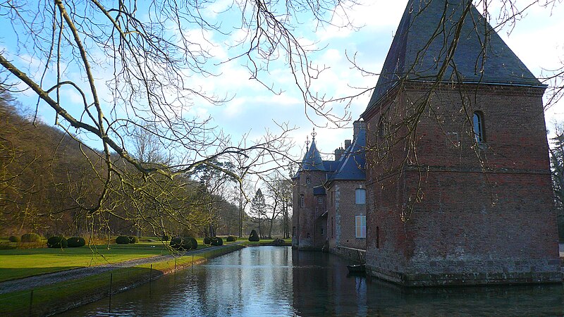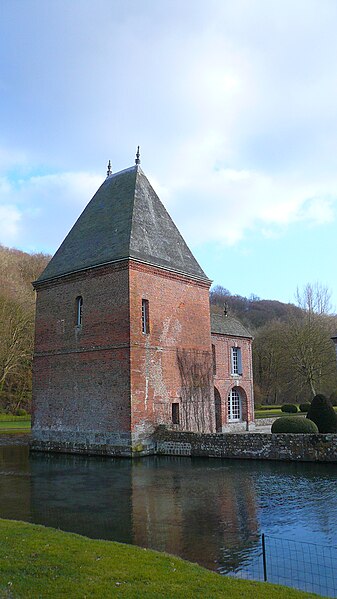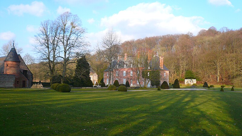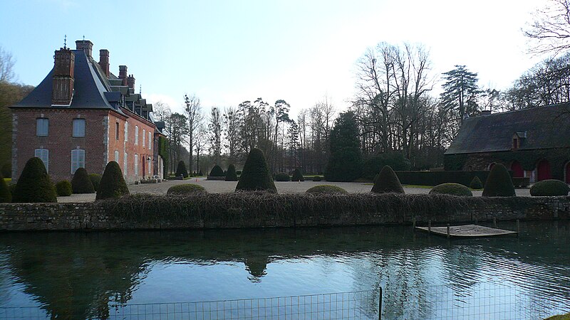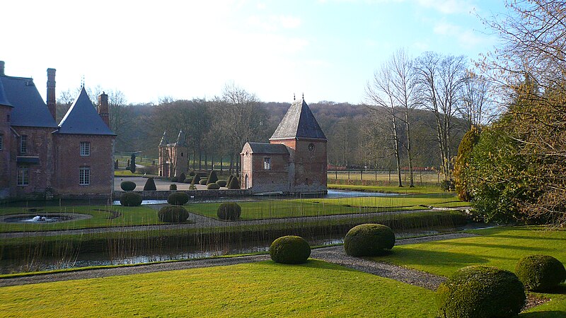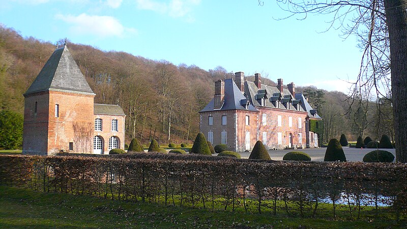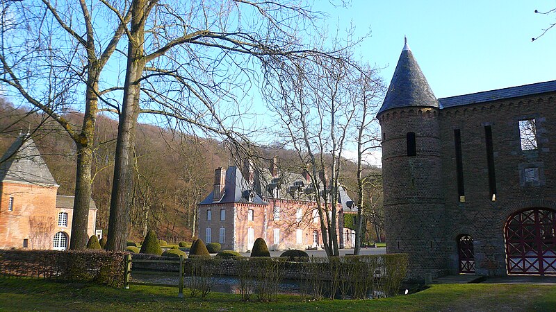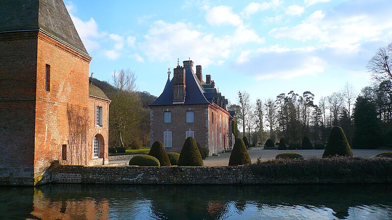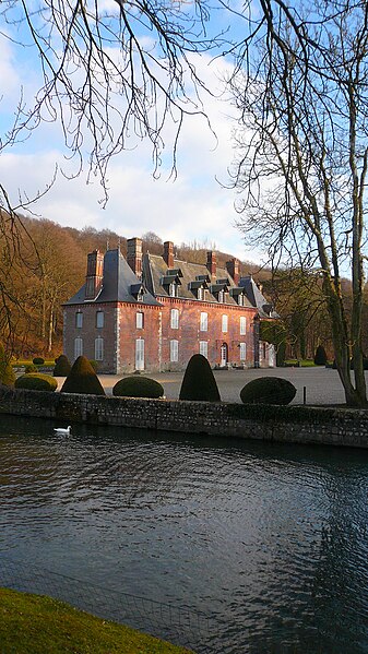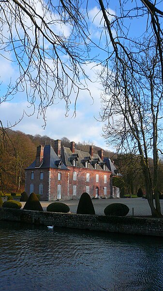 Le Manoir de Bimorel, appelé aussi château d'Imbleville et parfois la « Perle de la Saâne » ou « château du Vivier », se dresse à Imbleville (Seine‑Maritime, Normandie). Propriété privée non ouverte à la visite, la demeure est inscrite aux monuments historiques par arrêté du 1er février 1944. Édifié à la fin du XVe siècle en briques roses sur un îlot formé par la Saâne, le logis fut élevé en 1491 par Janon (Zanon) de Dampierre et son épouse Marie de Gouvis, comme l'indique une inscription conservée au‑dessus de l'ancienne porte d'entrée. Implanté le long de la route de la vallée de la Saâne, entre Imbleville et Auzouville‑sur‑Saâne, le manoir cherchait à contrôler le passage de la vallée en profitant de la forme du cours d'eau. En 1597 la terre et le château furent acquis par Nicolas Baudry, avocat au Parlement de Normandie ; son fils Charles y mourut en 1651 et leurs descendants conservèrent le domaine jusqu'au début du XVIIIe siècle. Après divers partages, le domaine revint à Pierre‑Eustache de Dampierre, qui mourut en 1795 ; en 1801 la terre fut attribuée à l'aînée de ses filles, devenue l'épouse du marquis de Bimorel. Le dernier Bimorel mourut en 1842 ; son gendre Louis de Folleville hérita du domaine et le transforma au XIXe siècle en l'agrandissant et en l'entourant d'un parc alimenté par des eaux vives. Leur fils Daniel de Folleville de Bimorel y naquit le 5 janvier 1842. Entre 1917 et 1961, d'importants travaux de réfection furent menés par Madame de Saint Rémy et son fils Gilbert ; ils firent notamment installer, au pied de la colline boisée, un élégant escalier à double révolution provenant de l'ancien château des ducs d'Elbeuf. En 1987 la demeure appartenait au comte et à la comtesse de Boigne. Le château et les bâtiments annexes forment un ensemble harmonieux malgré leur apparence disparate : deux ailes carrées flanquent l'ancien corps de logis et, autour, le parc comprend pièces d'eau, canaux, jardins et douves alimentées exclusivement par des sources indépendantes de la rivière. À l'origine la Saâne atteignait la face sud de la cour et se partageait en deux bras qui défendaient la demeure ; au nord s'élevaient quatre tours — dont deux subsistent — abritant la herse et le pont‑levis, seul accès d'autrefois, tandis que des bâtiments de service se développaient entre la chapelle et ce passage. À l'est, une longue galerie à arcades en plein cintre reliait l'étage du logis à celui de la chapelle et servait de nef pour le public le dimanche. Au sud, un mur crénelé et une vaste tour sud‑ouest furent abattus au XIXe siècle. Entre 1850 et 1860 la Saâne fut détournée pour éviter les inondations et les douves actuelles furent creusées. Les vues du site présentent la tour carrée, les douves, l'escalier à double révolution au pied de la colline, l'entrée sud‑ouest avec son allée et la cour centrale, l'ancienne porte munie autrefois d'un pont‑levis, le potager derrière le mur, ainsi que le corps de logis principal et les aménagements d'eau qui structurent le parc.
