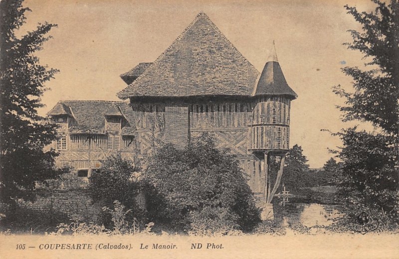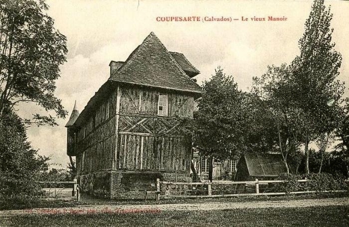 Le manoir de Coupesarte se dresse à Coupesarte, commune déléguée de Mézidon Vallée d'Auge, dans le Pays d'Auge, département du Calvados, entre Saint-Julien-le-Faucon et Le Mesnil-Durand, et entre Saint-Pierre-sur-Dives et Lisieux. Édifié sur l'emplacement d'une bâtisse fortifiée, il est daté des XVIe au XVIIIe siècle, tandis que des éléments plus anciens — fondations d'une tour d'angle découvertes à la fin des années 1970 et une lucarne trilobée réutilisée — renvoient à des aménagements médiévaux. Au XVe siècle la famille d'Anisy en était propriétaire avant qu'il ne passe ensuite à la famille Le Prévost; plus tard, le fabuliste Jacques Charles Formage (1749-1808) y est né et le manoir appartient à la famille Le Viconte en 1767. Transformé en ferme, l'ensemble conserve une ossature en pans de bois remarquable et une unité architecturale jugée exceptionnelle en Pays d'Auge. Il se compose de deux bâtiments en équerre posés sur un terre-plein entouré d'eau, flanqués de trois poivrières en encorbellement aux angles des façades extérieures. La partie principale se situe dans l'aile sud ; le rez-de-chaussée sud sert de cellier et garde des traces du colombage originel, tandis qu'une travée contenant l'escalier sépare le logis ancien de l'aile en retour. Le rez-de-chaussée présente un pan de bois vertical avec une allège à croisillons et des fenêtres irrégulières ; un hourdis de tuileaux et briques donne à la façade une teinte rosée. Deux tourelles, placées symétriquement aux angles nord-est et sud-est, servaient de latrines, et le colombage a été repris en quasi-totalité lors des restaurations. L'édifice conserve des décors peints d'une grande authenticité : la chambre à l'étage dite chambre de l'amour ou chambre de Cupidon présente un décor mythologique avec un Amour chevauchant un lion, une Junon accompagnée d'un paon et une Junon guerrière, ainsi qu'une représentation de jardin en trompe-l’œil; les lambris portent vases, couronnes, urnes et palmes sous des guirlandes, et les plafonds d'étage conservent poutres et solives peintes à motifs floraux. Le sol comporte des pavés de terre cuite vernissée attribués à des ateliers du Pré-d'Auge ou de Manerbe. L'édifice, qui a subi peu de remaniements hormis des percements de fenêtres et des aménagements intérieurs réalisés au XVIIe siècle, a été endommagé le 18 août 1944 lors de la bataille de Normandie : une bombe a atteint un angle, projetant l'escalier au grenier et détruisant les écuries. Les travaux de restauration effectués après-guerre ont valu au manoir, au début des années 1960, le prix Chefs-d'œuvre en péril. Au début du XXIe siècle l'état du bâtiment restait préoccupant : fissures au pignon de l'aile du XVIIe siècle, risque d'effondrement d'une échauguette du XVe siècle, problèmes de fondations et infiltrations ayant dégradé colombages et cheminées. Une convention a été signée entre les propriétaires réunis en société civile immobilière et la Fondation du patrimoine pour lancer un appel aux dons et réaliser les travaux dans un délai de cinq ans. Propriété privée, le manoir autorise les visites extérieures et, avec ses dépendances et ses douves, il est classé au titre des monuments historiques par arrêté du 21 octobre 1947.