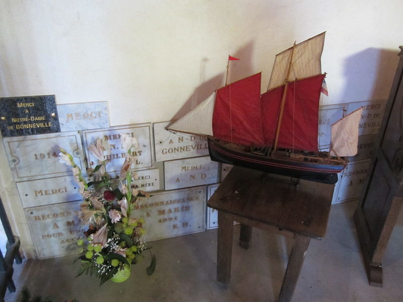 Le manoir de Gonneville, situé à Blainville‑sur‑Mer dans la Manche, est une demeure du XVe siècle transformée en exploitation agricole. Sa chapelle, dédiée à la Vierge et à saint Philibert, existe depuis 1050 et a été reconstruite au XIVe siècle. On y célébrait une messe solennelle au départ et au retour des terre‑neuvas. Le bâtiment principal se présente comme un corps de logis en équerre, avec une tourelle polygonale dans l'angle intérieur servant d'escalier. La chapelle abrite plusieurs ex‑voto : un tableau représentant un bateau dans la tempête daté du XVIIIe siècle, deux maquettes de la fin du XIXe siècle — les trois‑mâts « Notre‑Dame de Granville » et « Marie », classées au titre des objets — ainsi qu'un navire à deux mâts, un second tableau, un vitrail, un bateau en bouteille et une statue de Notre‑Dame. Après la Seconde Guerre mondiale, Herman Menke et Geneviève de Saint‑Pern, tous deux engagés dans les combats de la Libération, ont restauré le manoir dans la tradition. Les façades et les toitures de la chapelle, dite « chapelle des Marins », sont inscrites au titre des monuments historiques par arrêté du 5 avril 2005, constituant la protection partielle du site.