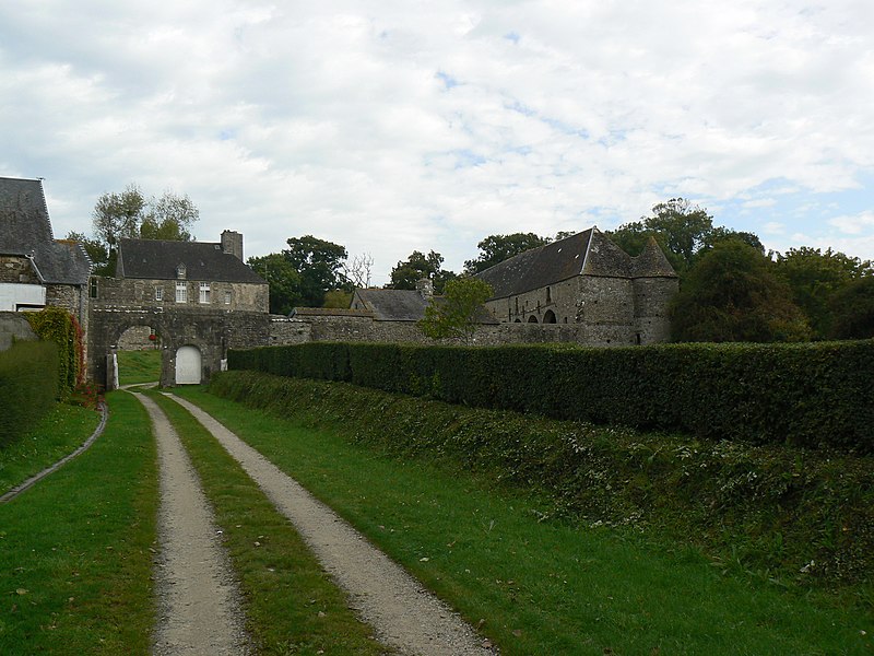 Du Moyen Âge subsistent principalement des éléments de l'enceinte extérieure, qui présente une forme carrée d'environ 65 mètres de côté. L'accès à la cour se fait par un porche double, charretière et piétonne, en arc en plein cintre, flanqué à gauche d'une tourelle défensive percée de trous à fusil ; cette tourelle a perdu une partie de son élévation et sa toiture en poivrière, sa partie haute servant autrefois de colombier. À droite du porche apparaissent les restes d'une grosse tour circulaire, qui devait abriter le grand colombier, et, en angle sud-est, une tourelle en poivrière accessible depuis le premier étage de la charreterie. Les bâtiments qui encadrent l'entrée correspondent aux communs : à gauche une vaste grange avec aire à battre et une porte en anse de panier aujourd'hui obturée, à droite un bâtiment à un étage comprenant le cellier, la charreterie aux quatre grandes arcades reposant sur des piliers carrés à larmier, et l'écurie dotée d'une porte haute ; la date de 1663 associée à François Pittebout et Charlotte Thomas est gravée sur ce bâtiment. Le reste de la cour est ceint de hautes murailles, avec une tourelle conservée à l'angle nord-est tandis que la tourelle côté sud a disparu.