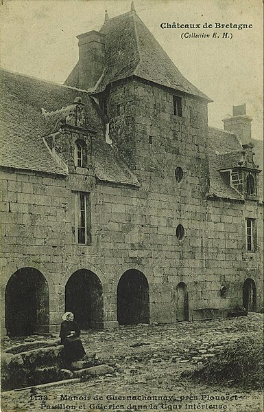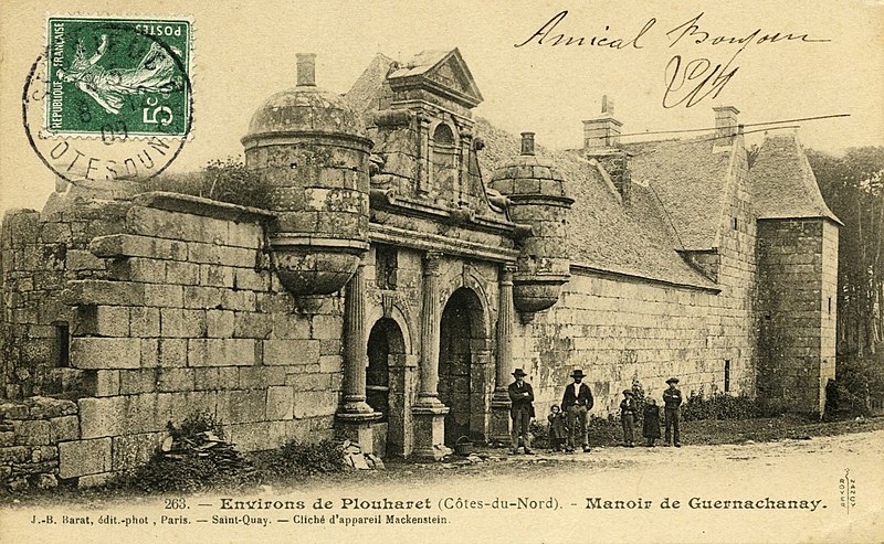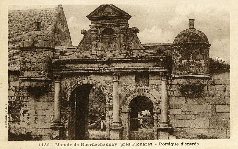 Le manoir de Guernac'hanay est une demeure située à Plouaret, dans les Côtes-d'Armor. D'après le dénombrement de 1861, il constitue l'archétype de l'architecture civile du Trégor à la fin du XVIe siècle et apparaît comme le plus imposant des seize manoirs alors recensés dans la commune. Fondée par la famille de Guernac'hanay, la seigneurie passa ensuite aux familles de Coëtmohan, Keranrais, Le Goalès (Le Gualès), La Lande, Coskaër et de la Vigne, puis fut acquise au XVIIIe siècle par le président de Robien, qui la conserva jusqu'à la Révolution. Le corps de logis présente au rez-de-chaussée une galerie de six arcades et un haut pavillon abritant l'escalier ; les communs, perpendiculaires au logis, se prolongent vers un vaste portail monumental ouvrant sur la cour. Ce portail, construit en grand appareil de granit, est très ornemental : il est flanqué de larges échauguettes en encorbellement et les portes charretières et piétonnes sont surmontées d'un fronton muni d'une niche. L'ornementation — colonnes cannelées et galbées à chapiteaux corinthiens sur piédestaux, rainures continues, claveaux cannelés en relief, niche centrale et gargouilles — rapproche ce décor du style attribué à l'architecte Jean Le Taillanter. Des recherches récentes situent la construction du portail dans la période 1560-1585, tandis qu'une analyse dendrochronologique a daté les poutres de la galerie à arcades entre 1602 et 1616. Les commandes du portail et du logis sont parfois imputées soit à Constance de la Lande et Michel de Cosquer, soit à Yves du Cosquer et Julienne Loz, seigneurs de Guernac'hanay à la fin du XVIe siècle. Le manoir fut loué à des familles de laboureurs et d'agriculteurs ; les dernières familles occupantes furent les Le Sec'h puis les Jorand, qui quittèrent les lieux en 1976. Le monument est inoccupé depuis cette date et fait l'objet d'une inscription au titre des monuments historiques depuis le 18 mars 1991.