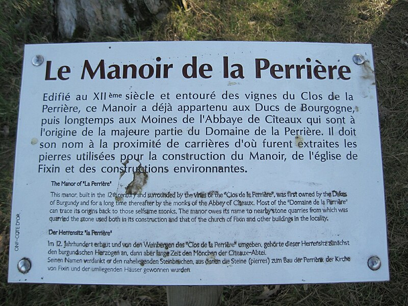 Le Manoir de la Perrière, situé à Fixin (Côte-d'Or) en bordure de la route des Grands Crus, remonte au XIIe siècle et est lié au Clos de la Perrière. Entre 1142 et 1622, il appartient aux moines de l'abbaye de Cîteaux, qui en font à la fois un centre d'exploitation viticole et une maison de convalescence. Au XIVe siècle, un pressoir à leviers et à taissons est installé dans le cellier ; ce pressoir, l'un des plus anciens de Bourgogne, est mentionné dans un inventaire de 1622 et n'a pas été modifié lors des transformations des XVIIIe au XXe siècle. Le domaine est vendu à des propriétaires privés au XVIIe siècle et subit de nombreuses transformations par la suite. La famille Joliet acquiert le domaine au XIXe siècle et l'exploite de père en fils, produisant notamment le Fixin 1er Cru Clos de la Perrière (4,5 hectares de pinot noir et 0,5 hectare de chardonnay). Au début du XXe siècle, le manoir fait l'objet d'une rénovation, avec l'ajout d'une tourelle entre 1926 et 1929, qui pourrait provenir de la destruction d'un hôtel particulier de Dijon. Le manoir est inscrit aux monuments historiques depuis le 9 septembre 1996 et son pressoir à leviers, daté des XIVe et XVIIe siècles, est classé depuis le 3 février 2000.
