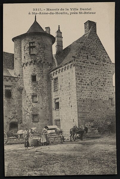 Le manoir de la Ville-Daniel se situe à Plaine-Haute (Côtes-d'Armor), en Bretagne. Il était le centre d'une seigneurie relevant de la baronnie de Quintin ; le domaine, d'un rapport médiocre, permit à la famille Le Voyer de s'enrichir par mariages successifs au XVIe siècle ; cette famille fut propriétaire de l'édifice de 1426 à 1617. La construction du manoir semble remonter à cette époque, d'après la date 1559 gravée au sommet de la tour, aujourd'hui illisible. Les bâtiments s'organisent autour d'une cour trapézoïdale dont l'angle nord est occupé par un grand logis ; en contrebas se trouve un bâtiment d'un seul niveau destiné aux dépendances et, au sud-est, la ferme. Le logis comprend un corps principal auquel se greffe une aile en retour d'équerre ; dans l'angle rentrant, une tour hors-œuvre abrite l'escalier qui assure la distribution intérieure, et une petite tour hémicirculaire, au revers de l'aile, servait de latrines. Tel qu'il apparaît aujourd'hui, le logis n'est que la réalisation partielle d'un ensemble plus important. Le décor met en valeur la porte d'entrée, la tour d'escalier et les parties hautes du bâtiment : la porte, en anse de panier, est surmontée d'une accolade fleuronnée ornée de choux frisés qui abrite un écusson aux armoiries effacées. Le manoir est partiellement protégé au titre des monuments historiques : il a été classé par arrêté du 5 juillet 1985 et inscrit par arrêté du 23 décembre 1985. Sont notamment protégés le corps de logis principal ainsi que les façades et toitures du bâtiment des communs faisant face au logis.