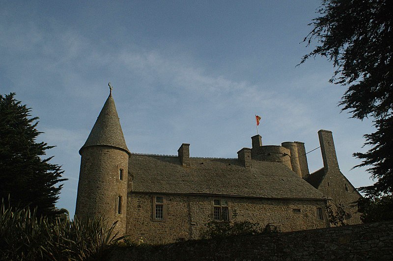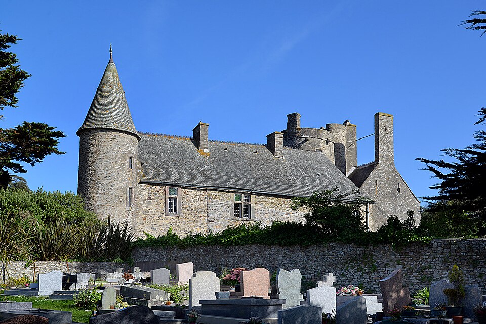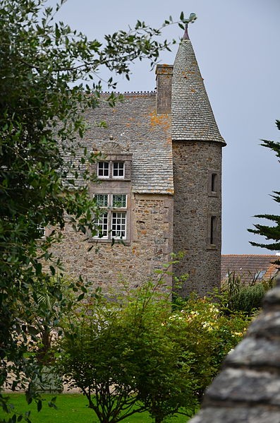 Du château médiéval subsistent principalement le donjon, une portion du mur d'enceinte et l'emplacement de la douve. Les bâtiments actuels, de style Renaissance cotentinaise, comprennent deux corps de logis perpendiculaires reliés par le donjon du XIIe siècle, édifiés entre la fin du XVIe et le début du XVIIe siècle, avec des lucarnes coiffées de frontons ornés de boules. Construits en pierres du pays, avec des murs atteignant près d'un mètre d'épaisseur à certains endroits, ils présentent des fenêtres à meneaux, de larges cheminées et une toiture en schiste. Le colombier, élevé en 1732 à l'extérieur de l'enceinte, contient plus de mille cases et illustre les dépendances typiques de l'édifice. Les façades et toitures du château et de son pigeonnier, ainsi que celles de l'ancien fort en bordure de la Manche et de sa maison de gardien, ont été inscrites au titre des monuments historiques par arrêté du 5 mai 1972.