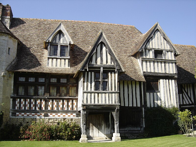 Le site s'organise autour d'une enceinte polygonale dont un côté est occupé par un logis en colombages et plusieurs bâtiments accolés. L'élément le plus ancien conservé semble être la base en pierre qui réunit une tourelle d'escalier octogonale en bel appareil calcaire, adossée au corps de maçonnerie où s'ouvrent trois cheminées. De part et d'autre de cet ensemble en pierre furent édifiées, au début du XVe siècle, deux bâtisses à pans de bois : celle de droite abritait un cellier, un pressoir à cidre avec tour à piler et presse à longue étreinte, ainsi qu'un grenier à pommes; elle se distingue par une avancée en colombages protégée par un toit à deux versants, une façade à damier rose et blanc et deux lucarnes de gabarits différents. La bâtisse de gauche, entièrement en colombages, correspondait au logis seigneurial. Dans le prolongement, mais formant un angle oblique, se trouve l'ancienne maison du fermier, également en colombages et à façade symétrique; le poteau d'huisserie entre ses deux portes porte une tête d'évêque sculptée.