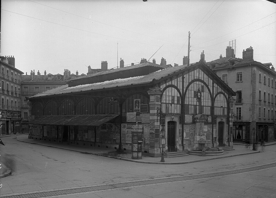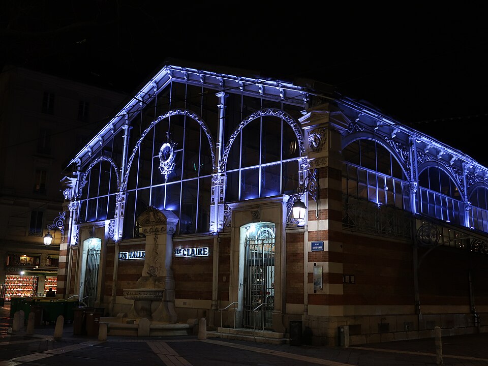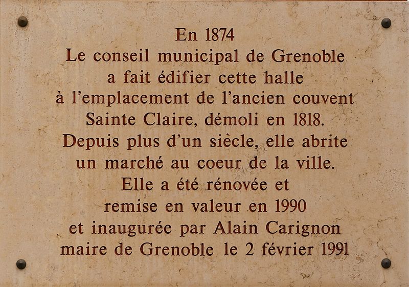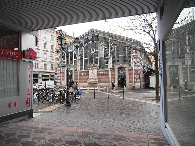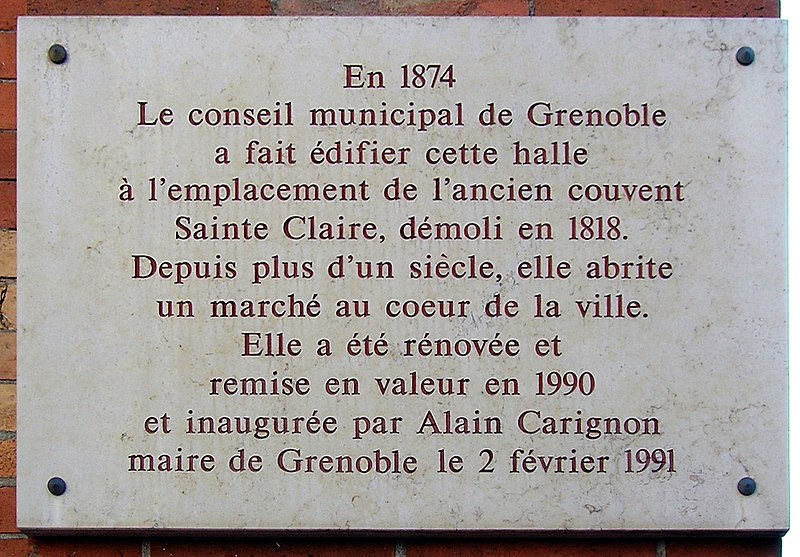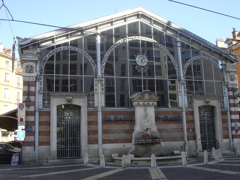 La halle Sainte-Claire est un marché couvert inscrit au titre des monuments historiques et situé place Sainte-Claire, dans le centre ancien de Grenoble (Isère, Auvergne‑Rhône‑Alpes). Datant de la fin du XIXe siècle, l'édifice a été conçu par l'architecte Hector Riondel et inscrit aux monuments historiques le 23 mai 2007. Le choix d'implanter un marché sur cette place remonte à l'acquisition du terrain de l'ancien couvent Sainte‑Claire en 1820 ; un marché est créé en 1825, complété par une modeste halle et une fontaine en 1830. Face au succès populaire, la construction d'une halle plus importante est décidée en 1867 et se concrétise par l'édification d'un nouveau bâtiment en 1874. La structure s'inspire des halles Baltard et combine des matériaux modernes pour l'époque : brique, verre et acier, la toiture reposant sur des piliers de fonte tandis que les murs de brique sont non porteurs. Les façades sont percées d'arcades en fer et ornées de frises ajourées en fonte ; elles présentent également des mascarons et des acrotères d'angle en forme de têtes de lion, réalisés par le sculpteur Clauses. Le toit est coiffé d'un lanternon aux quatre faces pourvues de persiennes en bois. Une fontaine décorait la façade principale ; elle a été conçue en pierre de Villebois par Clauses et représente un poisson entouré de rayons, surmonté de trois roses symbolisant les pouvoirs de la ville au Moyen Âge, présents sur les armoiries de Grenoble. À l'intérieur, une grande nef accueillait près d'une centaine d'étals. Jusqu'en 1963, le marché de gros se tenait en vis‑à‑vis de la halle avant d'être déplacé pour cause de saturation, et la halle elle‑même a fait l'objet d'une rénovation au début des années 1990. Aujourd'hui, le site reste un marché municipal en activité et s'intègre au secteur commercial du centre piétonnier. Installée au bout de la rue Alphand, la halle se trouve à proximité de l'office de tourisme, de la cathédrale Notre‑Dame et du vestige des remparts romains ; elle est accessible à pied dans la zone piétonne et desservie par les lignes B et D du tramway, dont la station porte le nom Sainte‑Claire‑les halles, au pluriel, bien que le lieu soit un bâtiment unique.