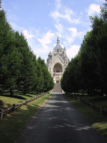 Le monument s'élève à 52 mètres et, perché au sommet d'une colline, se situe à 117 mètres au‑dessus de la Marne ; un chemin de ronde autour du clocher offre un large panorama sur la vallée et les champs de bataille. L'architecture, d'inspiration néo‑gothique, combine une apparence militaire — tour carrée crénelée et murs percés de meurtrières — et une organisation liturgique avec chœur, transept et croisée ; elle évoque la tradition des moines‑soldats du Moyen Âge. L'ensemble comprend une crypte, une chapelle supérieure, un cloître et un ossuaire, et fait l'objet d'une forte symbolique manifeste dans les piliers, la statuaire et les verrières ; les architectes successifs furent Alexandre Marcel puis Georges Alexandre Closson.