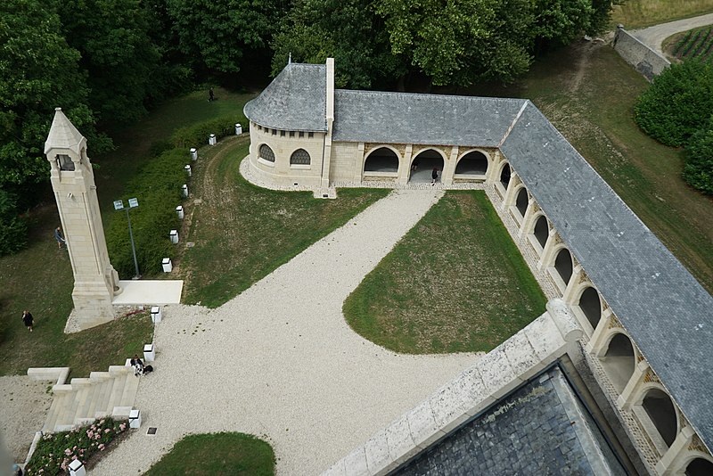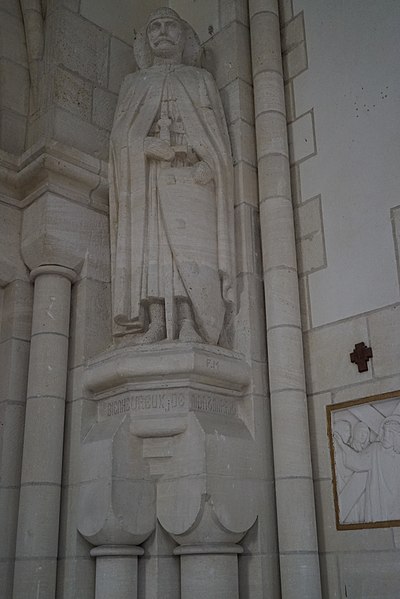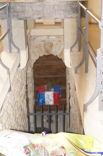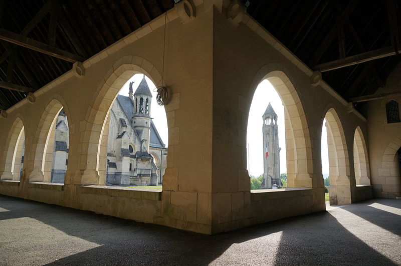 Pour atteindre l'ossuaire on passe au pied d'une lanterne des morts, symbole à la fois de lumière et de souvenir. Sous le cloître est inscrit l'organigramme des armées engagées lors des deux batailles de la Marne. L'ossuaire contient les restes de 1 360 soldats de toutes armées confondues ; seuls dix ont pu être identifiés de façon précise et une plaque récente reproduit leurs identités. Le clocher sert enfin de point géodésique pour l'IGN, inscrit au réseau NTF d'ordre 5.